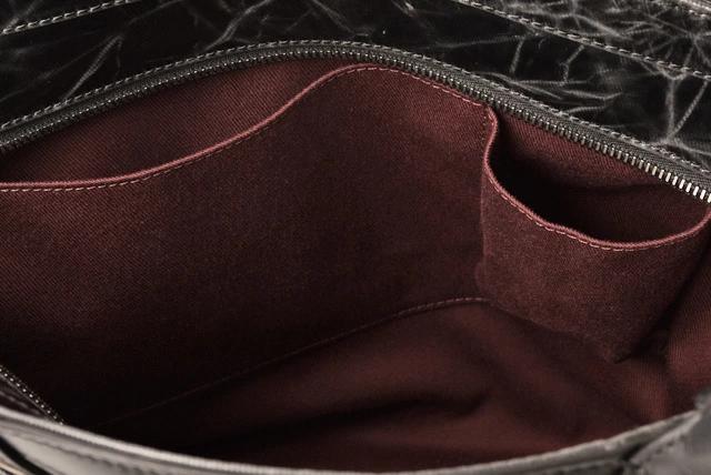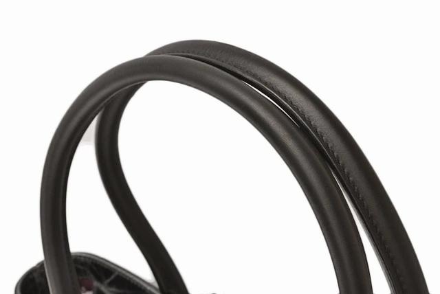 特殊加工を施したパテントレザー素材で、撥水性があり、傷や汚れにも強いデザインです。