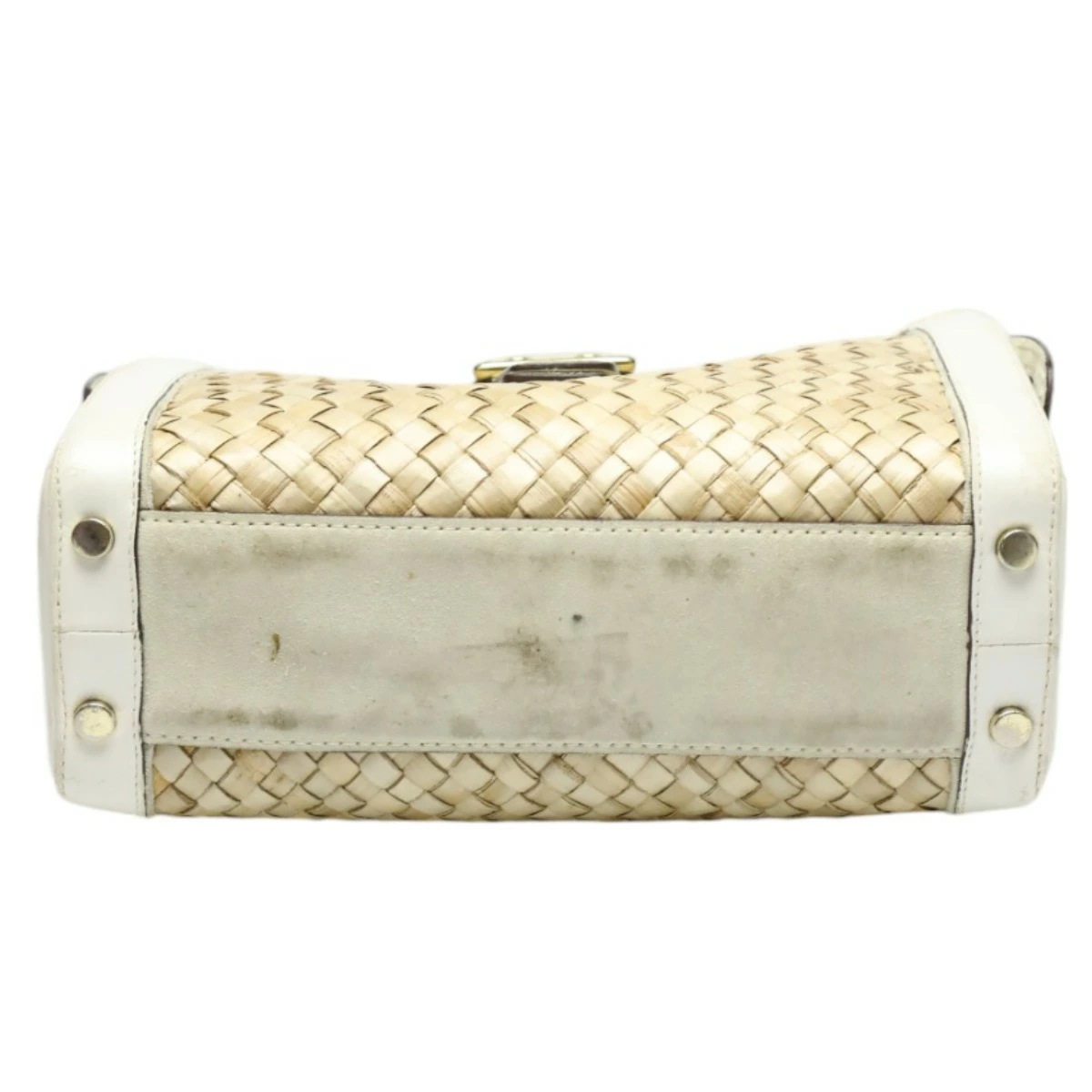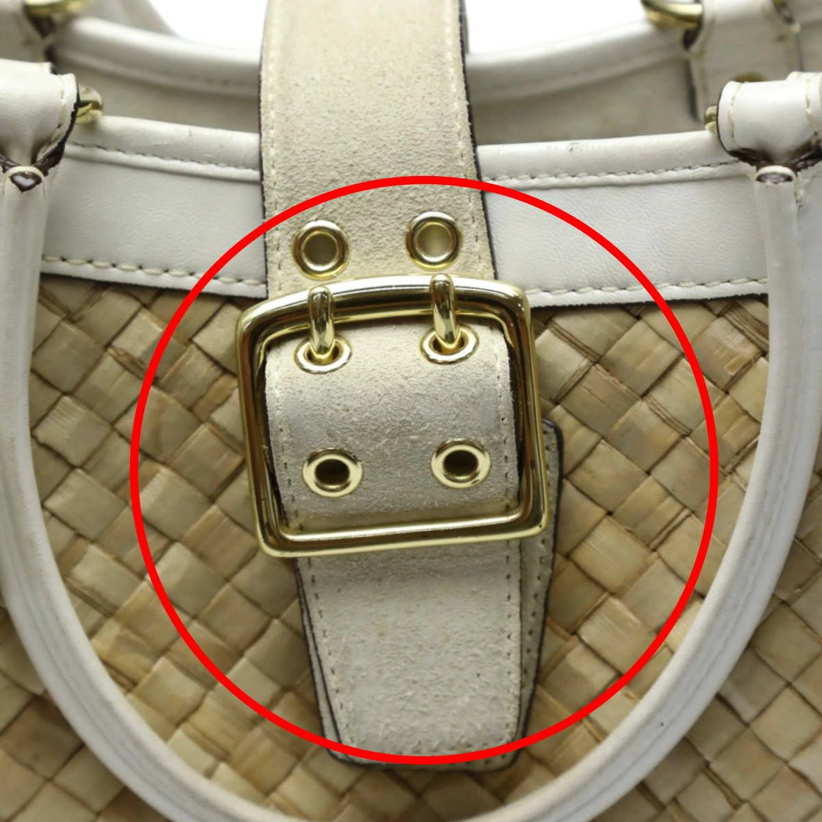 | 外側 | ランク:BC 表面:キズ、汚れ、スレ、破れ 切り替えし部分:キズ、汚れ、スレ、シワ 形状:やや型崩れ ハンドル・ストラップ:キズ、焼け、汚れ、スレ コーナー:キズ、汚れ、スレ、シワ レザー部分やスエード部分に汚れやキズ、シワやスレあります(画像4-12枚目参照) ハンドルに汚れあります(画像9、13枚目参照) 表面の編み込み部分に汚れやスレ、破れあります(画像14、15枚目参照) |