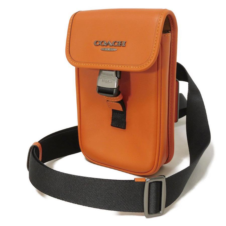 | スムースレザーコーチのメタルロゴがあしらわれた「レーサー フォーン クロスボディ バッグ」ミニショルダーバッグです。 |