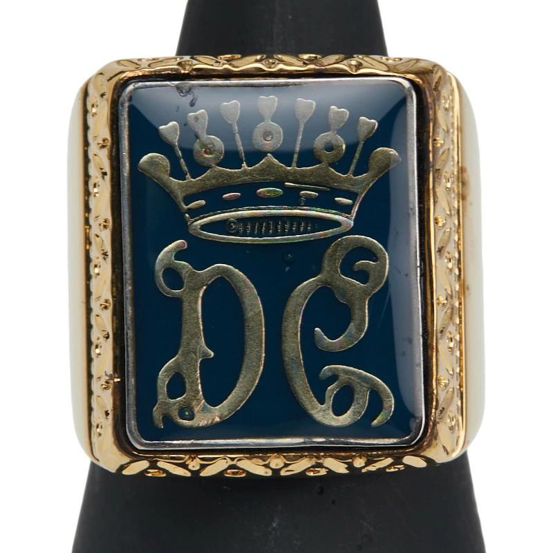Pre-owned Dolce & Gabbana DC logo crown motif ring in gold with blue plating for men.