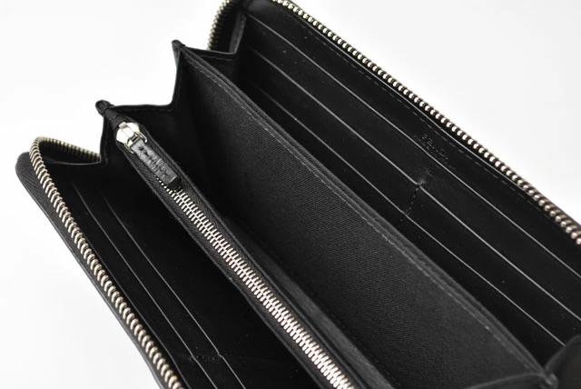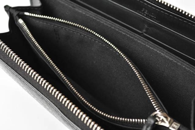 FENDI/フェンディより、ファスナー式長財布。艶やかな質感のカーフレザーに、FFロゴを施したマイクロズッカ柄。シックなブラックカラーで男女兼用でお使いいただけます。間仕切りポケットもあり、収納力があります。