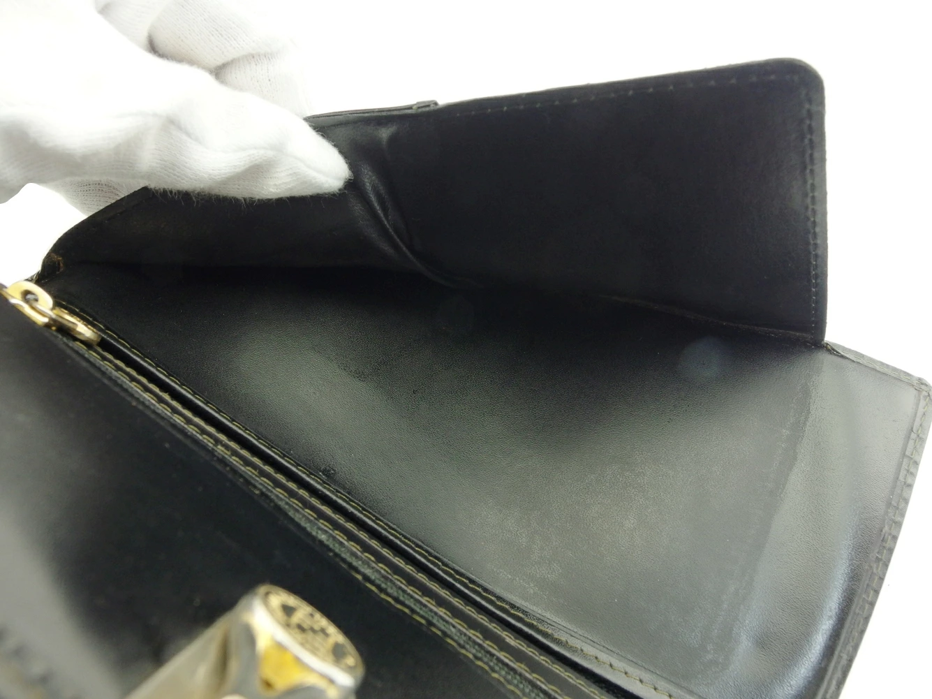 | コンディション | 全体の状態詳細:若干の痛みがございますが、まだまだご使用いただけます。 社外リペア跡(折り曲げ部分のコバ両サイドの切れ補修)あり。 外側:PVC(角スレ、汚れ、反り、折り曲げ部分のコバ両サイドに補修跡)、ロゴクロージャー(傷、くすみ、メッキハゲ)あり。 内側:レザー(形状跡、コバ両サイド補修跡)、片開き札入れ(形状跡、艶の消え)、各ポケット内(汚れ)、小銭入れ(ファスナー金具のメッキハゲ、内側に汚れ)、ロゴプレート(傷、メッキハゲ)あり。 この他、中古品のため 目立たない傷 汚れ などの一般的使用感がある場合がこざいます。ご了承ください。 |