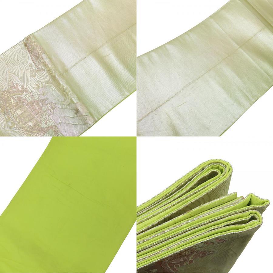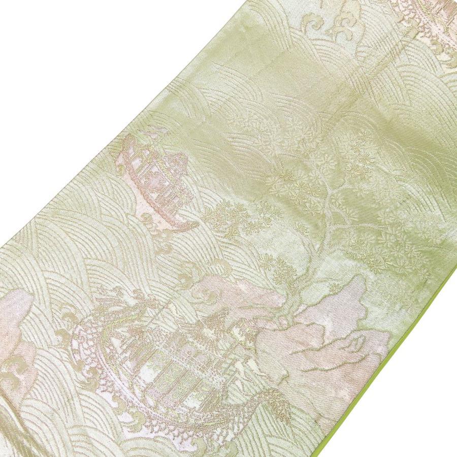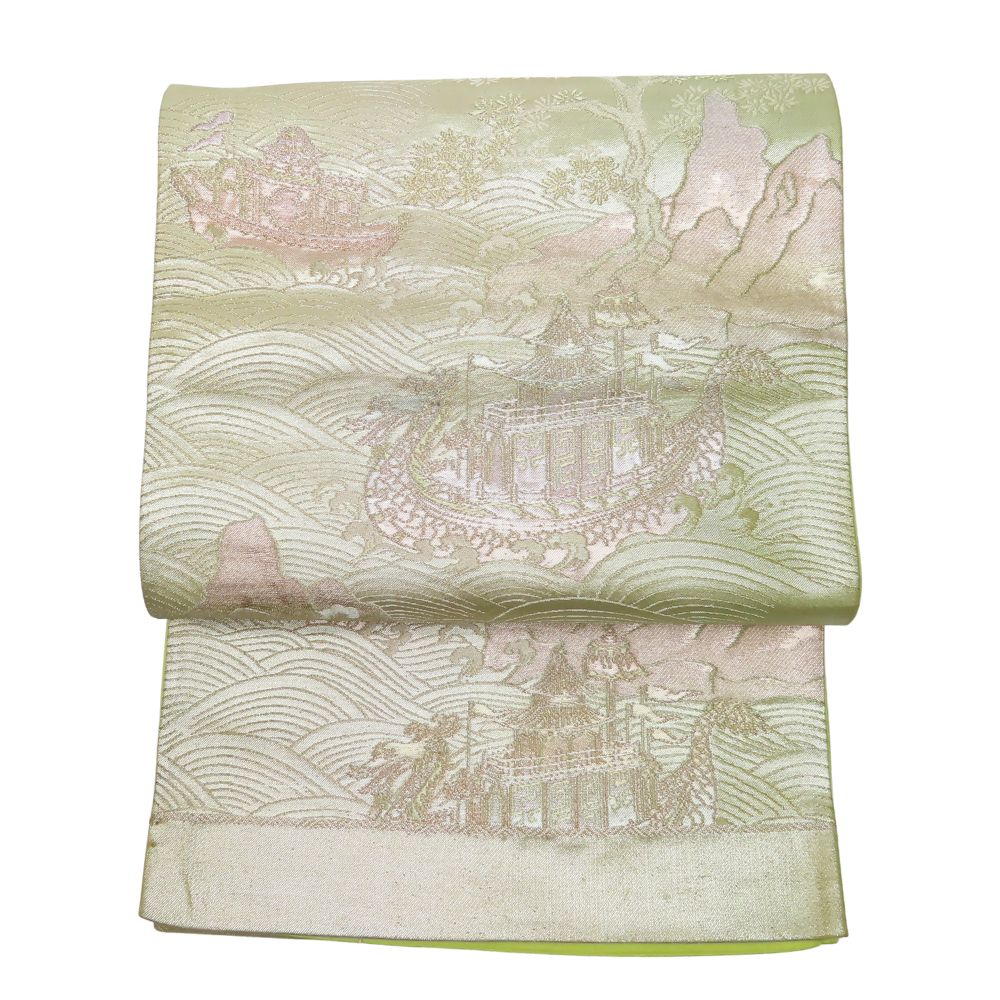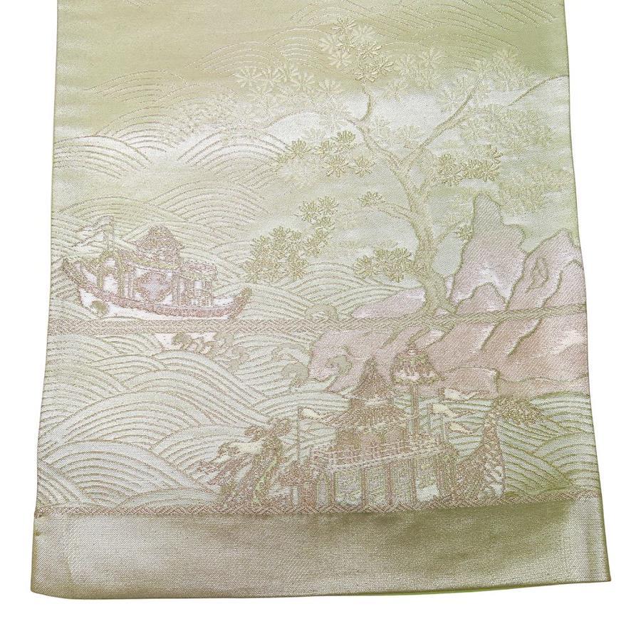 | 品名 | 【中古】 袋帯 1767 西陣織 正絹(金銀糸除く) シルバー系 ライトグリーン 六通柄 御所車 未仕立て レディース 女性 |