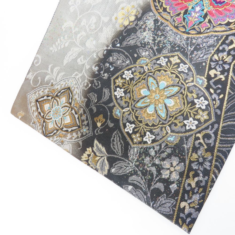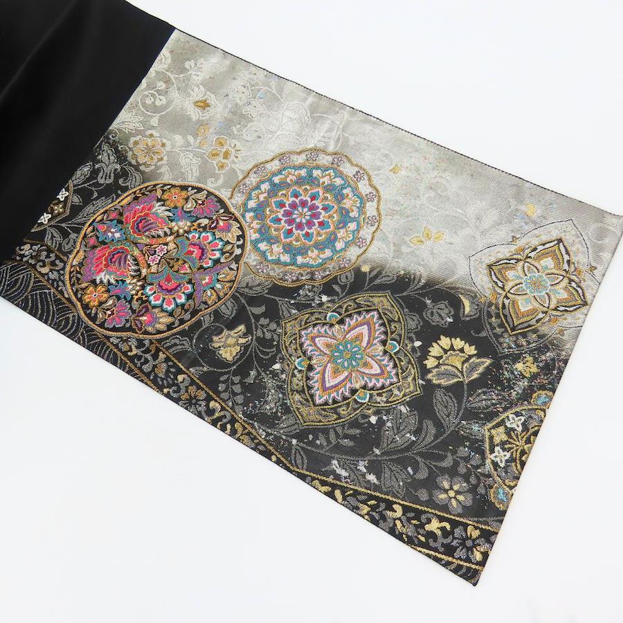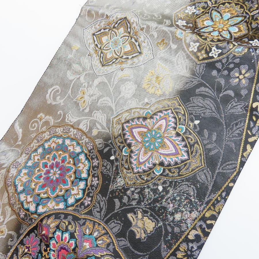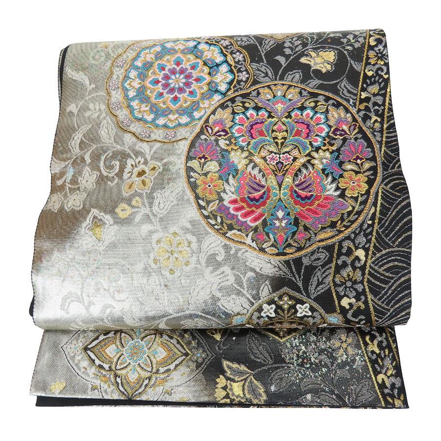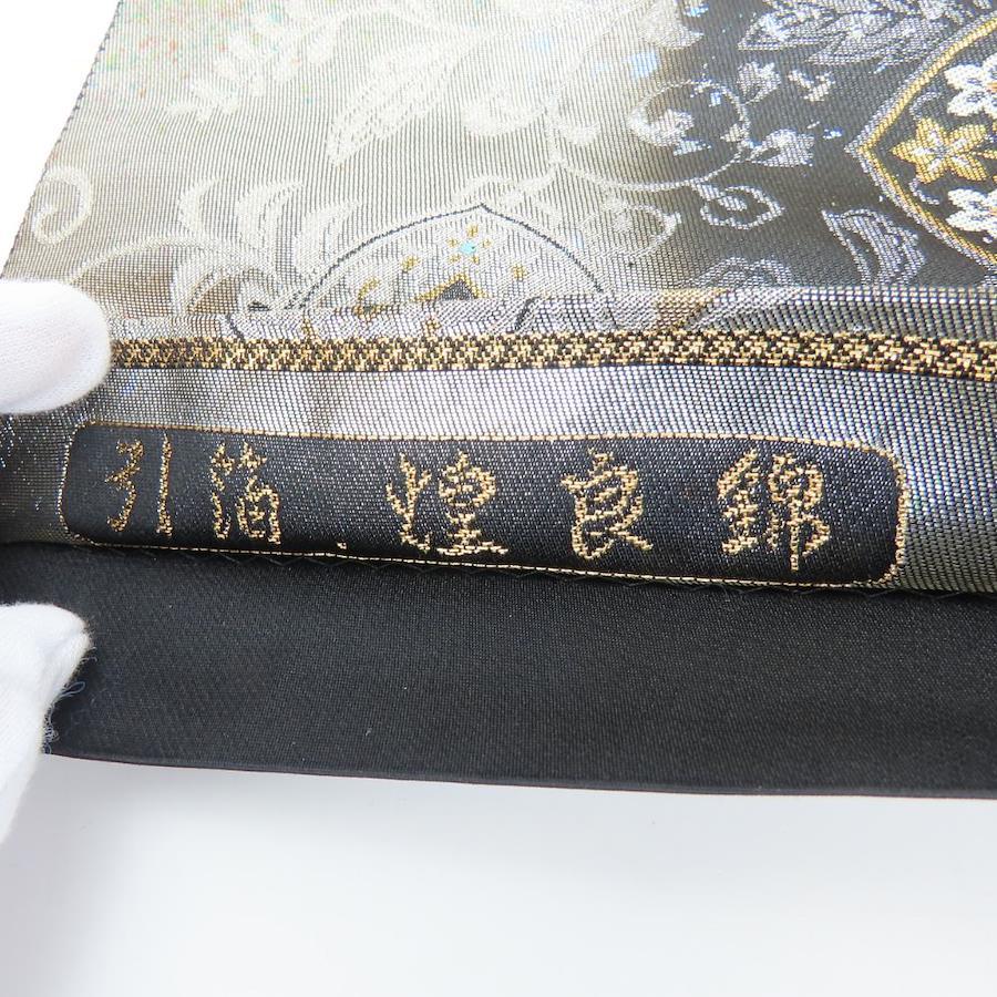 | 品名 | 【中古】 袋帯 煌良錦 正絹(金銀糸除く) シルバー系 ブラック 引き箔 花柄 お洒落 レディース 女性 |