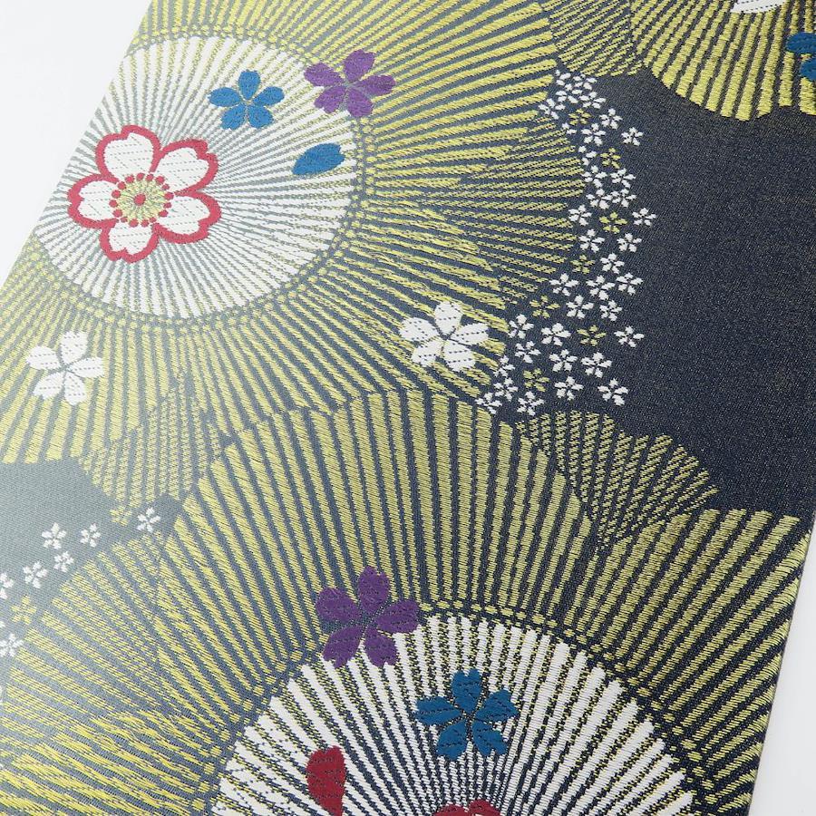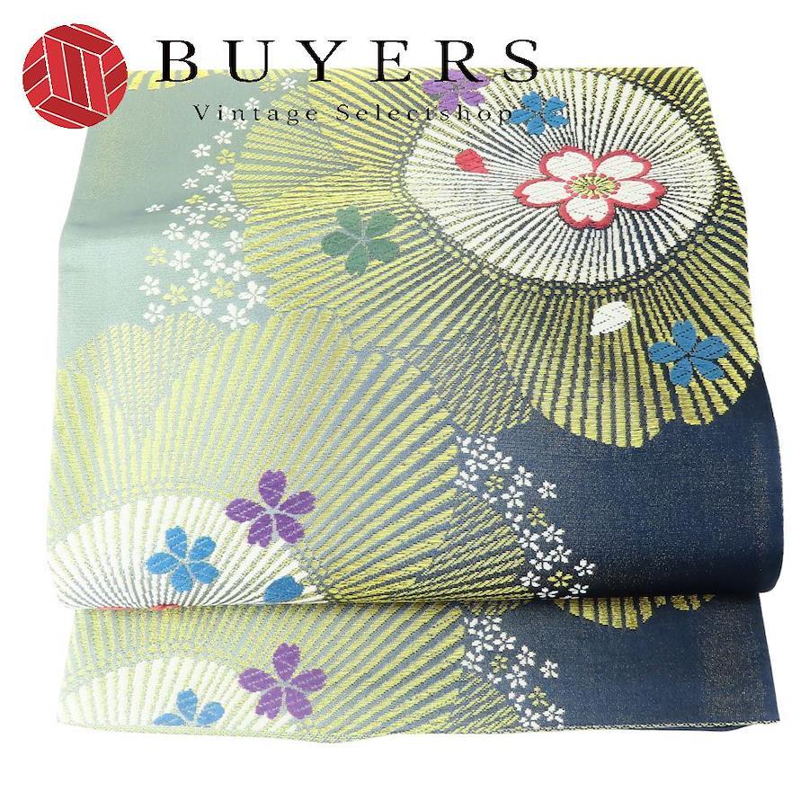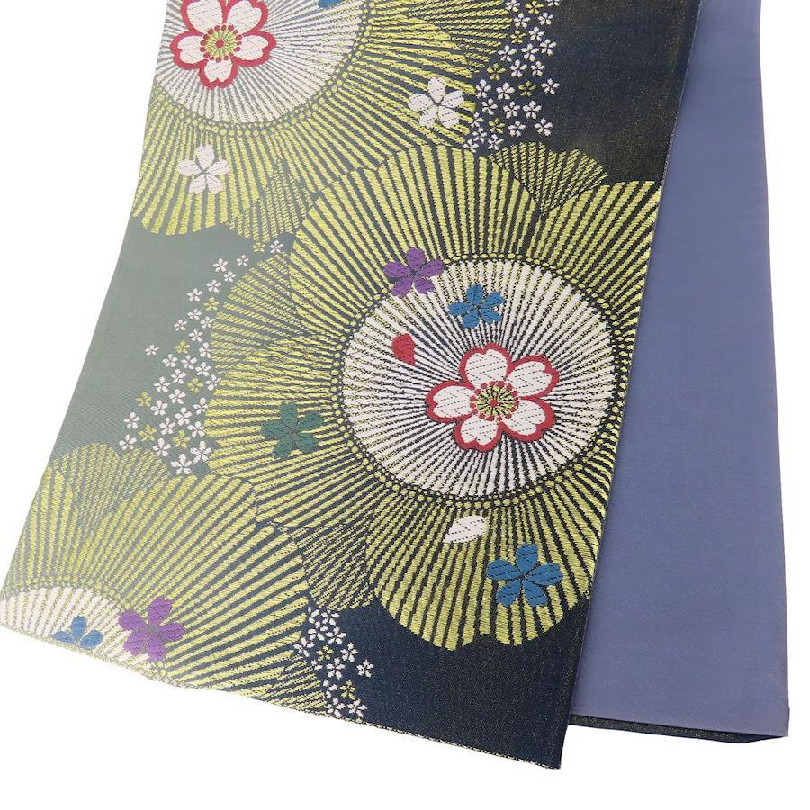 | 品名 | 【中古】 袋帯 正絹(金銀糸除く) モスグレー ゴールド ネイビー パープル 桜 レディース 女性 |