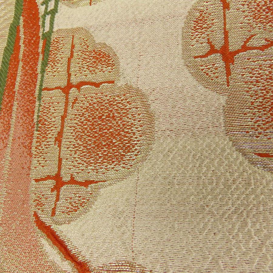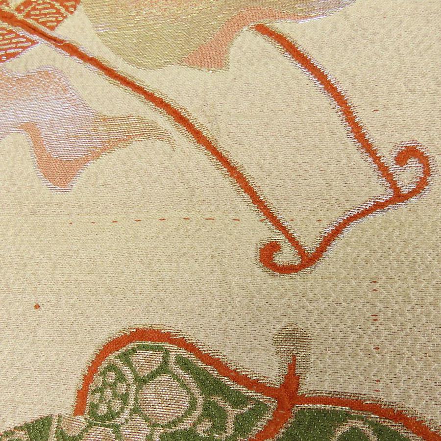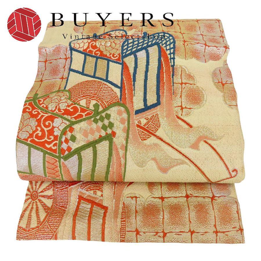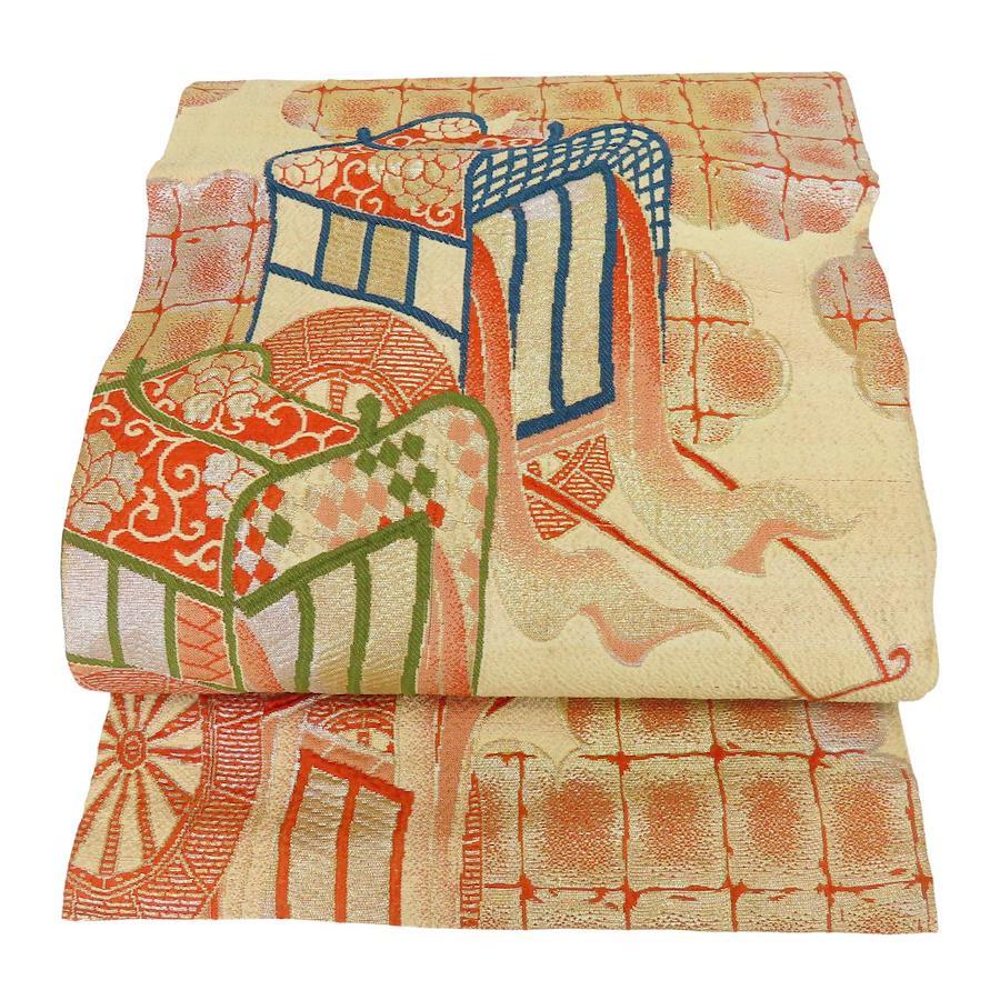 品名【中古】 袋帯 正絹(金銀糸除く) 金銀糸 ベージュ オレンジ ゴールド シルバー 全通柄 丸帯 御所車 レディース 女性