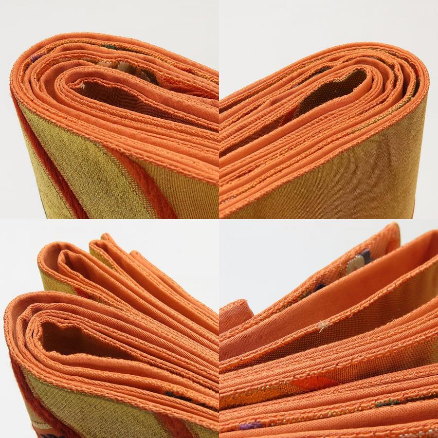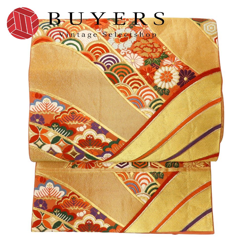 品名【中古】 袋帯 吉祥文様 正絹(金銀糸除く) ゴールド オレンジ系 マルチカラー 六通柄 花唐草 振袖用 レディース 女性