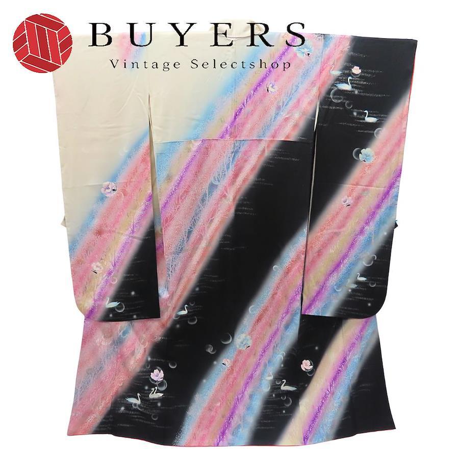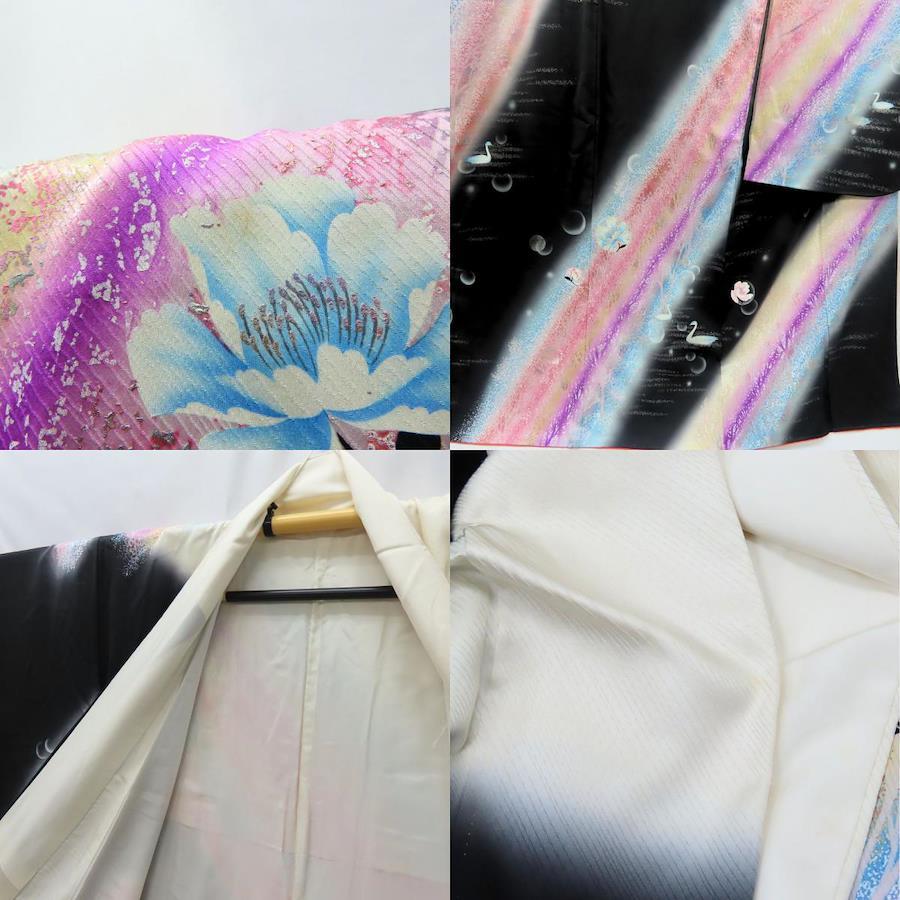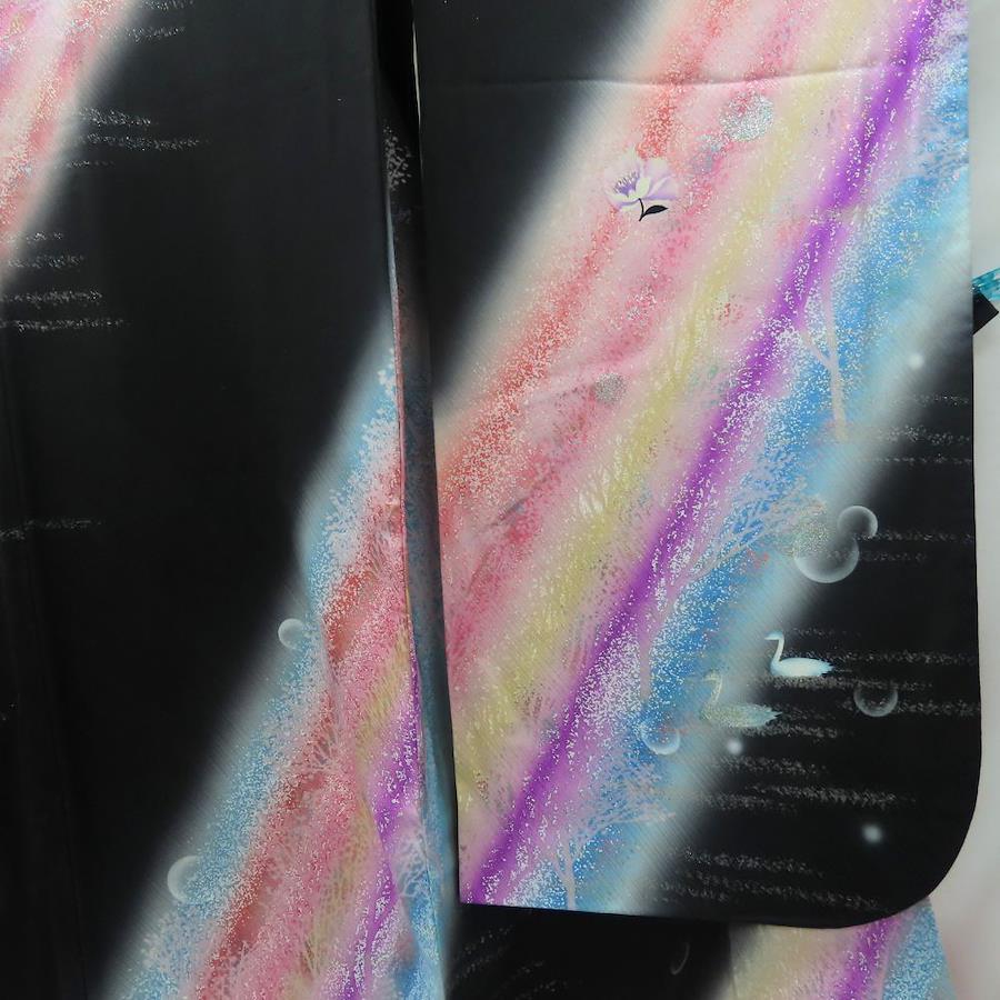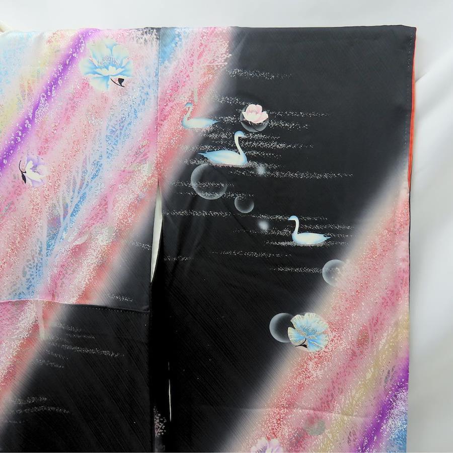 品名【中古】 振袖 正絹(金銀糸除く) ブラック ピンク 風景柄 水鳥柄 お洒落 レディース 女性