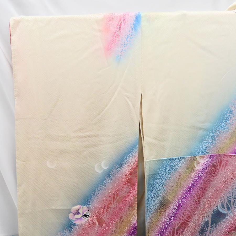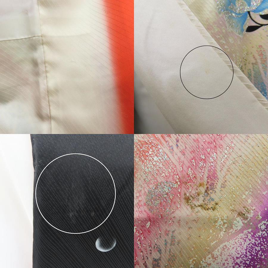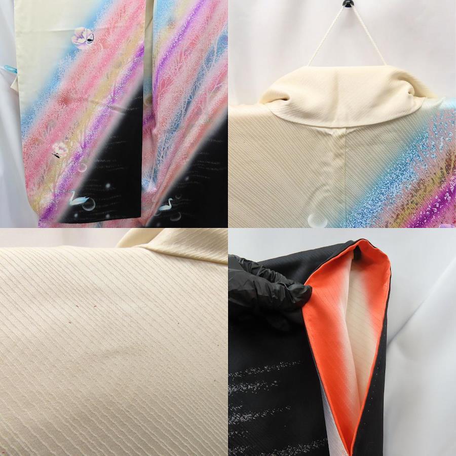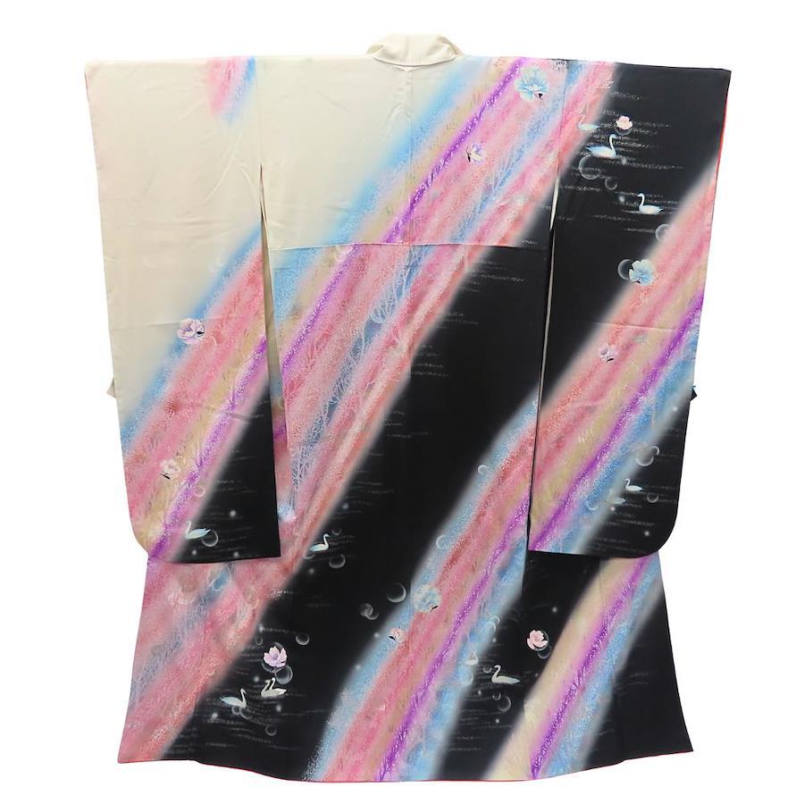 品名【中古】 振袖 正絹(金銀糸除く) ブラック ピンク 風景柄 水鳥柄 お洒落 レディース 女性