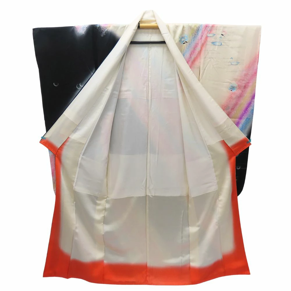 Pre-owned furisode (long-sleeved kimono) made of pure silk (excluding gold and silver threads) in black and pink with a landscape and waterfowl pattern. Stylish Japanese clothing, kimono, for women.