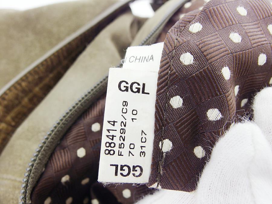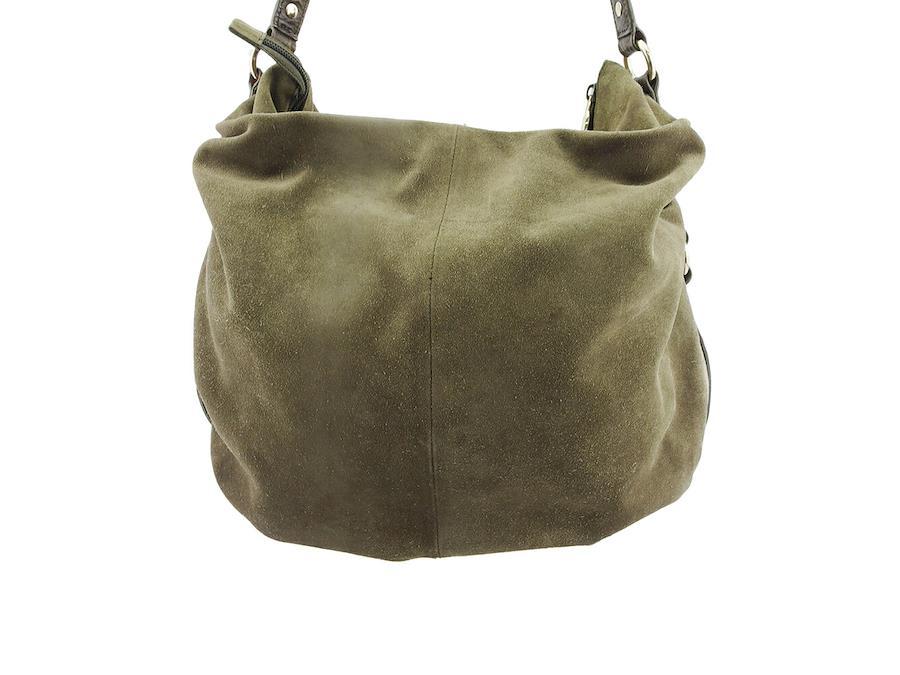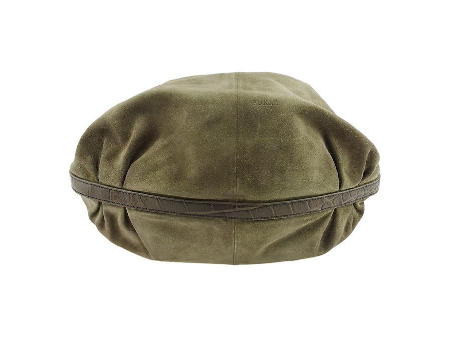 Pre-owned Furla shoulder bag in khaki and gold with side shirring and logo plate tag.