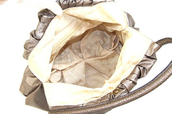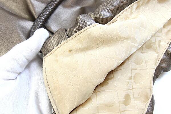 状態 | 外側:持ち手に若干ヨレ、フチに薄スレあり。ハンドル一部に芯抜けあり。 内側:シミあり。 金具:スレ、クスミあり。 |