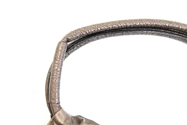 状態:外側:持ち手に若干ヨレ、フチに薄スレあり。ハンドル一部に芯抜けあり。内側:シミあり。金具:スレ、クスミあり。