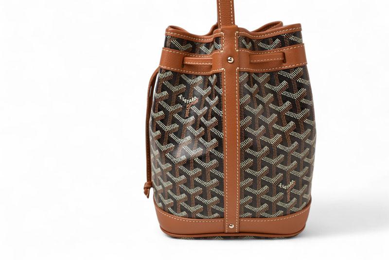 ゴヤール(GOYARD)の人気ライン「プティ・フロ」シリーズより、洗練されたバケットバッグのご紹介です。ブランドを象徴するゴヤールディンキャンバスと、上質なカーフレザーを組み合わせた逸品。コンパクトながらマチのあるシルエットで、スマホやお財布など必需品をすっきり収納できます。ショルダーストラップ付きで、ハンドバッグとしてもショルダーバッグとしても2wayでご使用いただけます。ショートショルダー、ミディアムロングショルダー、クロスオーバーまたはロングショルダーと、さまざまなタイプの持ち方が可能なのが特徴です。このバッグは、革製の紐で締めるため、中身を簡単に取り出すことができます。シックなブラックとナチュラルカラーのコントラストが、どんなコーディネートにも上品にマッチ。日常使いから特別なシーンまで幅広く活躍するアイテムです。