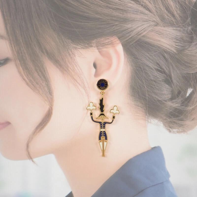 イエローゴールドプレートとエナメルを使用したこのピアスは、細部まで丁寧に描かれた花火師のモチーフが目を惹きます。