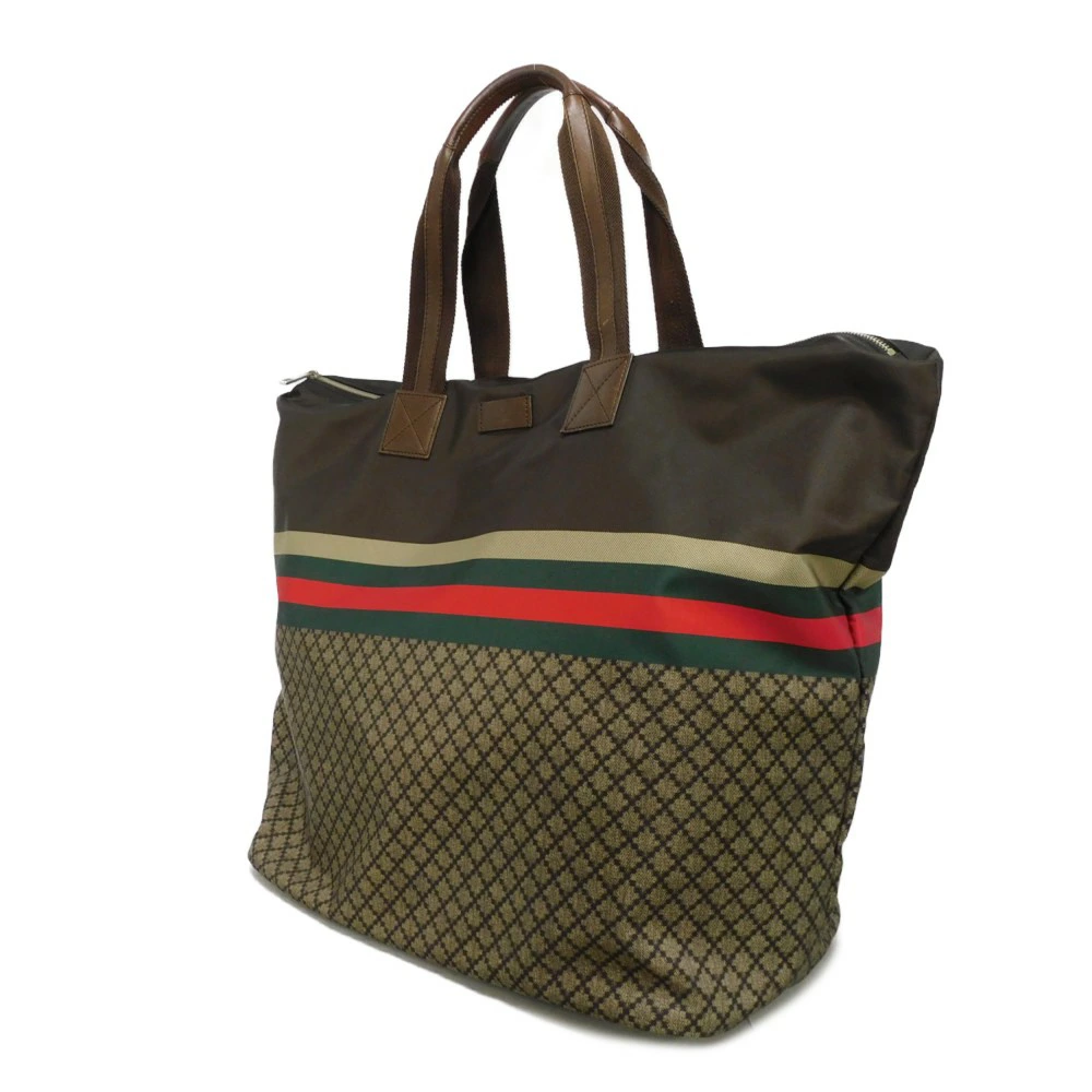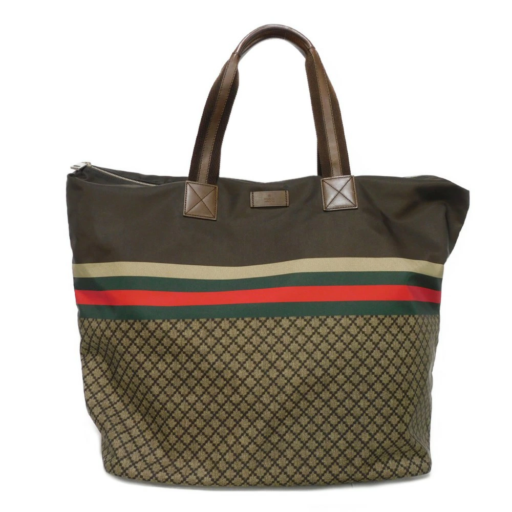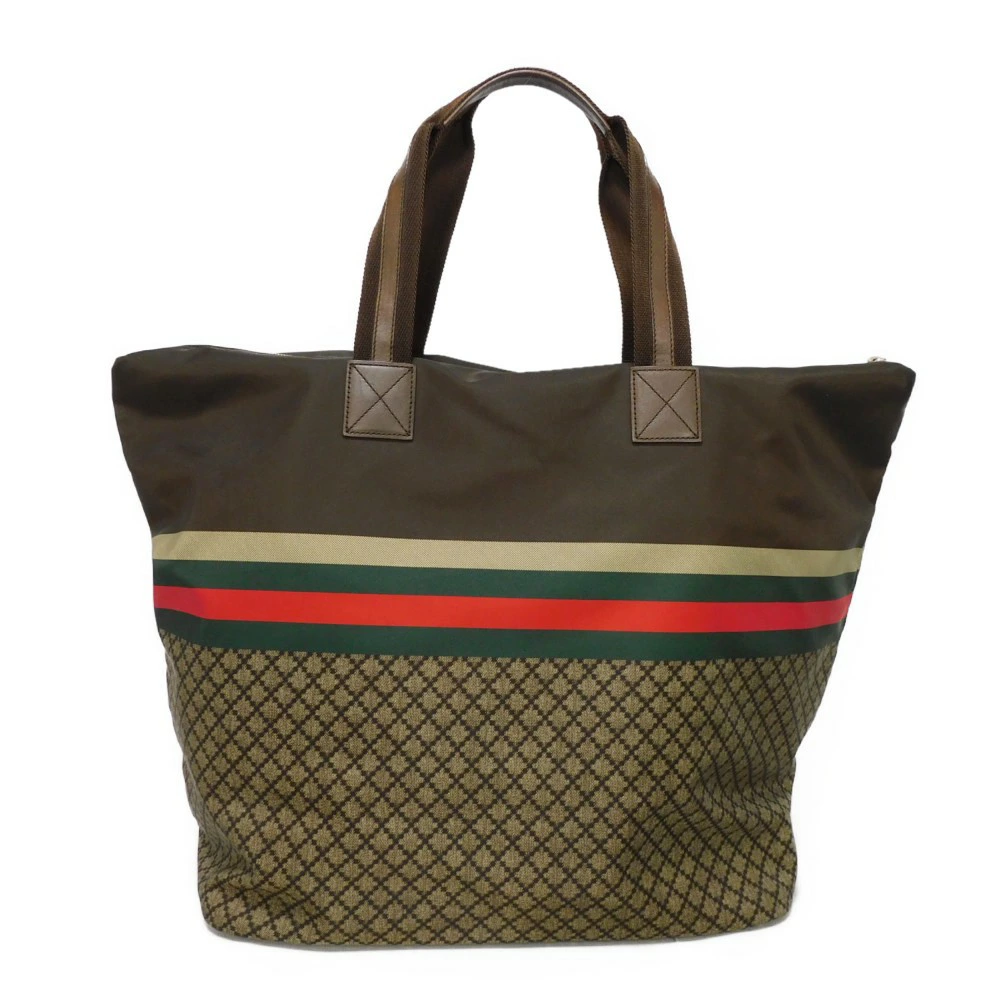 ディアマンテパターンとウェブストライプがプリントされた、ナイロン素材にグッチのロゴが刻印されたレザーパッチを組み合わせた「ディアマンテ トート」トートバッグです。 |