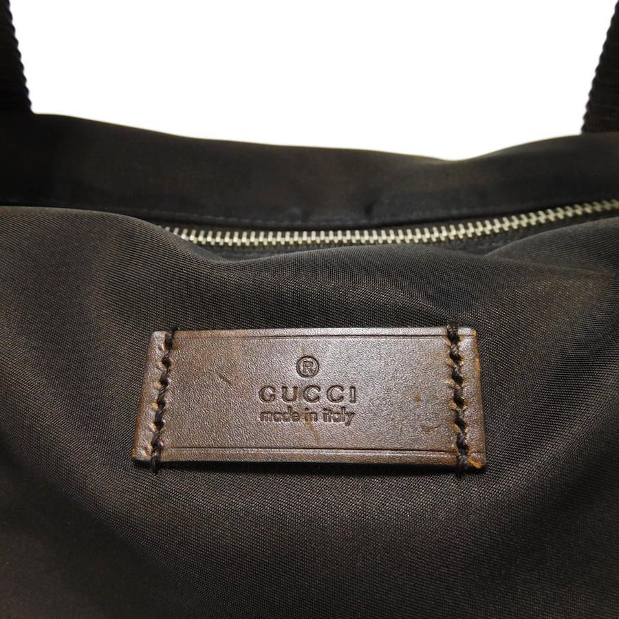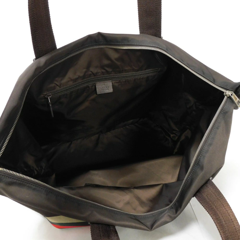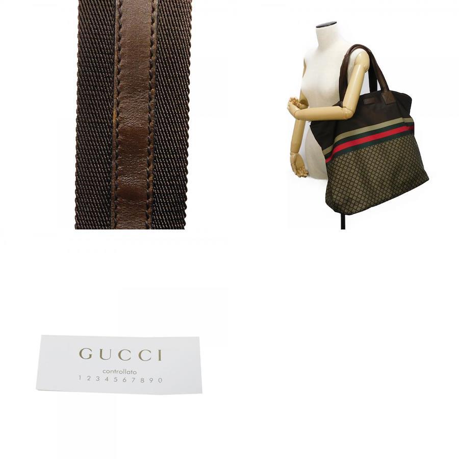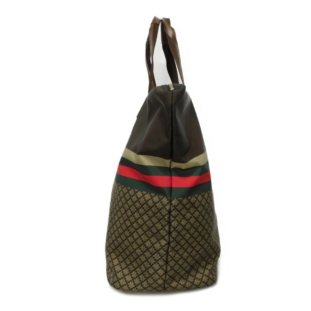 ディアマンテパターンとウェブストライプがプリントされた、ナイロン素材にグッチのロゴが刻印されたレザーパッチを組み合わせた「ディアマンテ トート」トートバッグです。 |