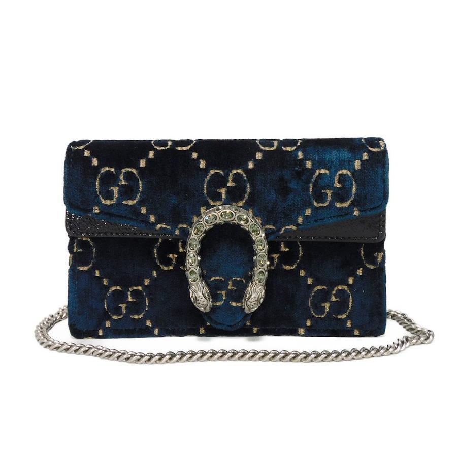 グッチのGGベルベットにクリスタルが装飾された、タイガーヘッドクロージャーを組み合わせた「ディオニュソス スーパー ミニ バッグ 」チェーンショルダーバッグです。