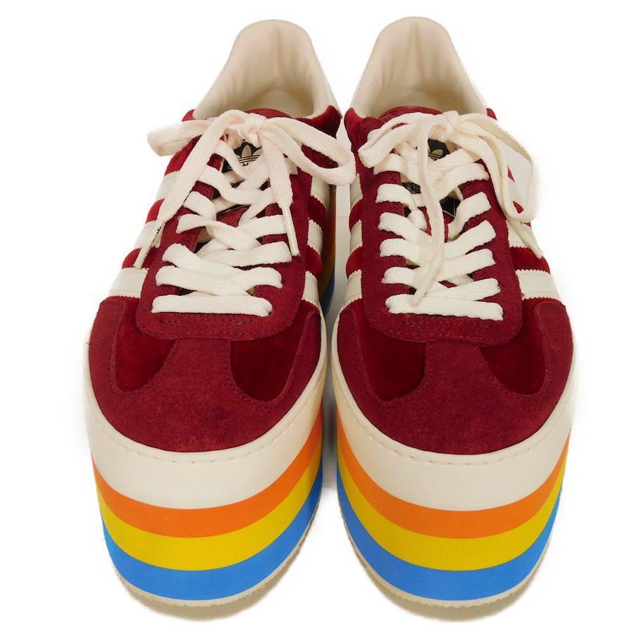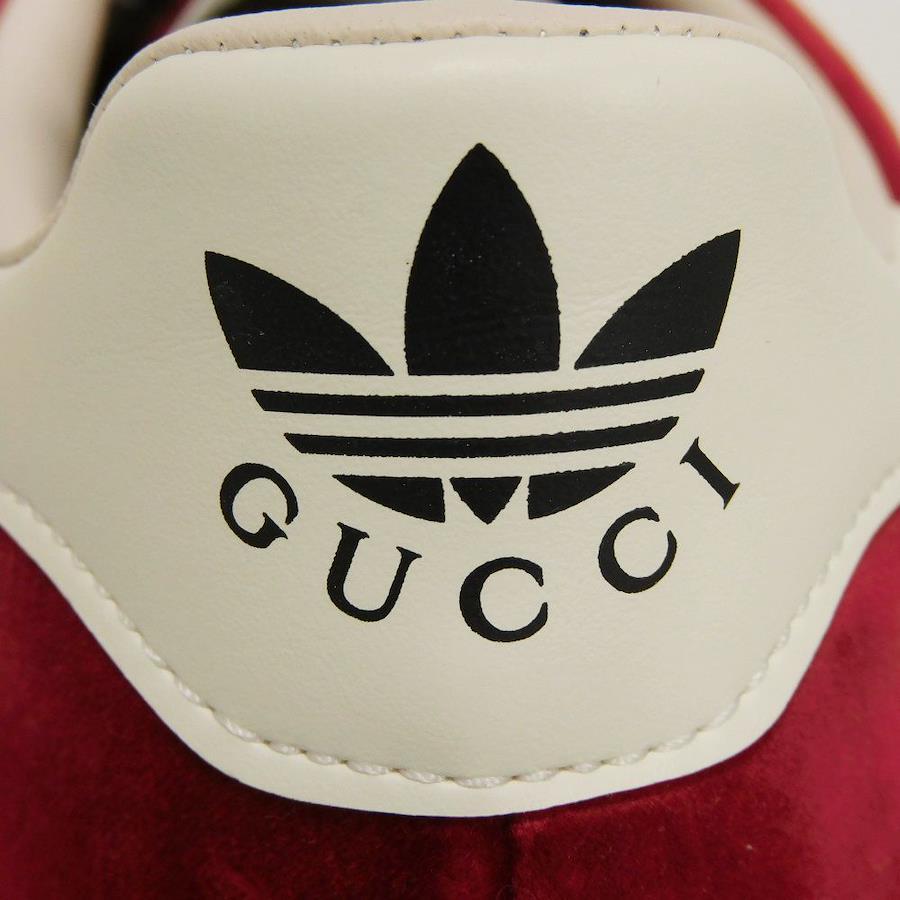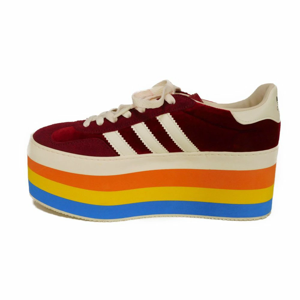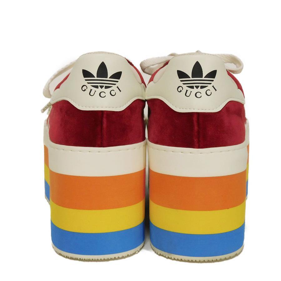 | ベルベット素材にグッチのロゴとアディダスのトレフォイルロゴがあしらわれた「ガゼル プラットフォーム」厚底ローカットスニーカーです。 |