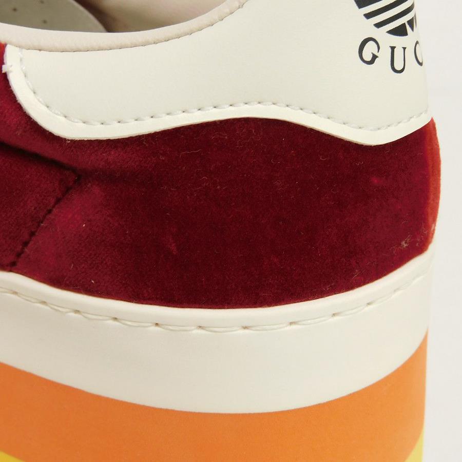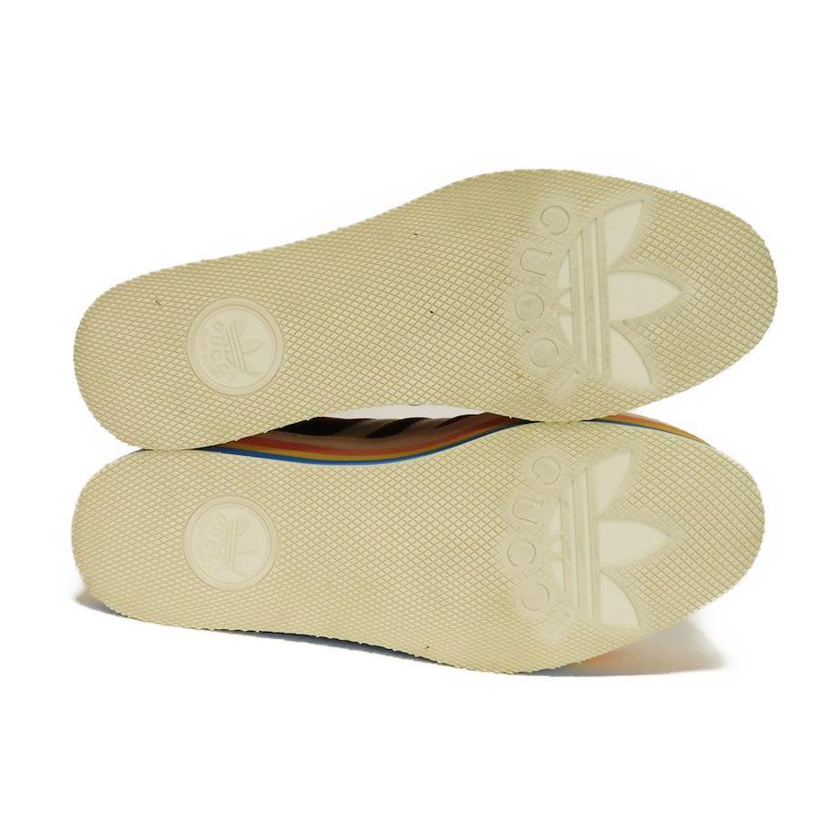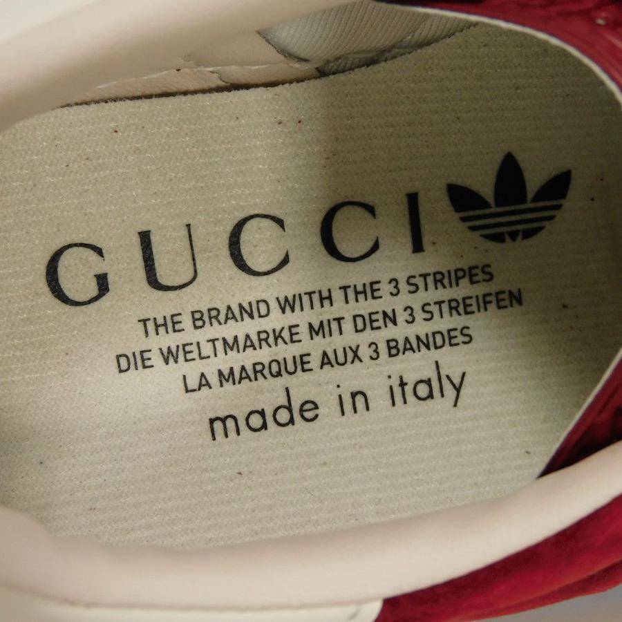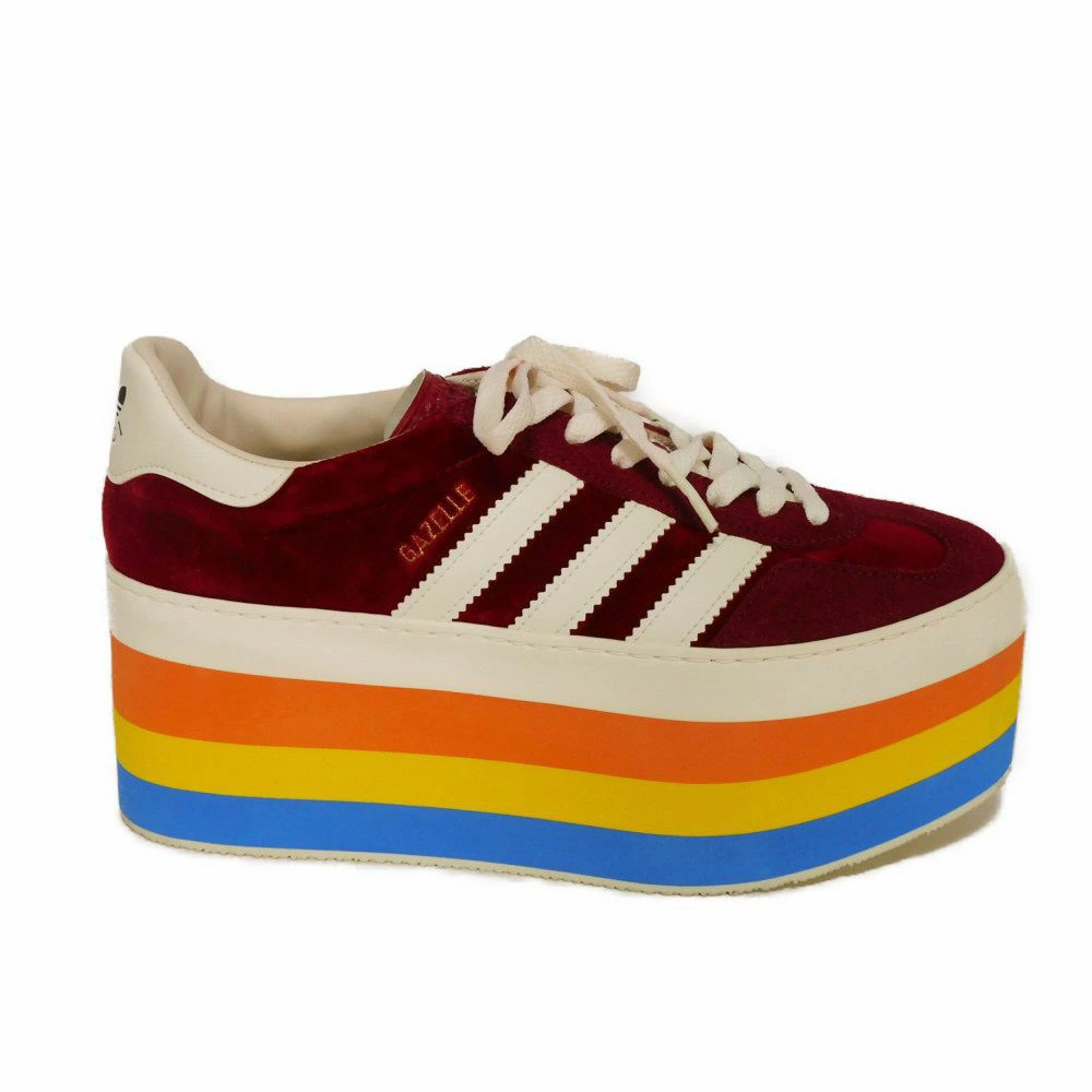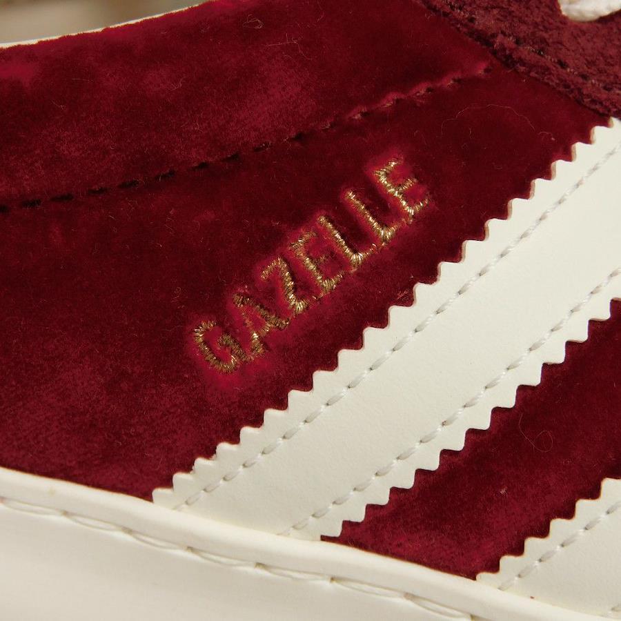 | ベルベット素材にグッチのロゴとアディダスのトレフォイルロゴがあしらわれた「ガゼル プラットフォーム」厚底ローカットスニーカーです。 |