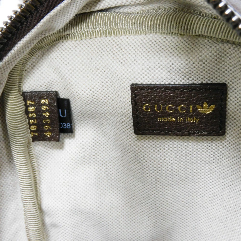 ビニールコーティングが施された、グッチのGGパターンにアディダスのトレフォイルロゴがエンボス加工された「GG クリスタル ミニ トップ ハンドル バッグ」ハンドバッグです。 |