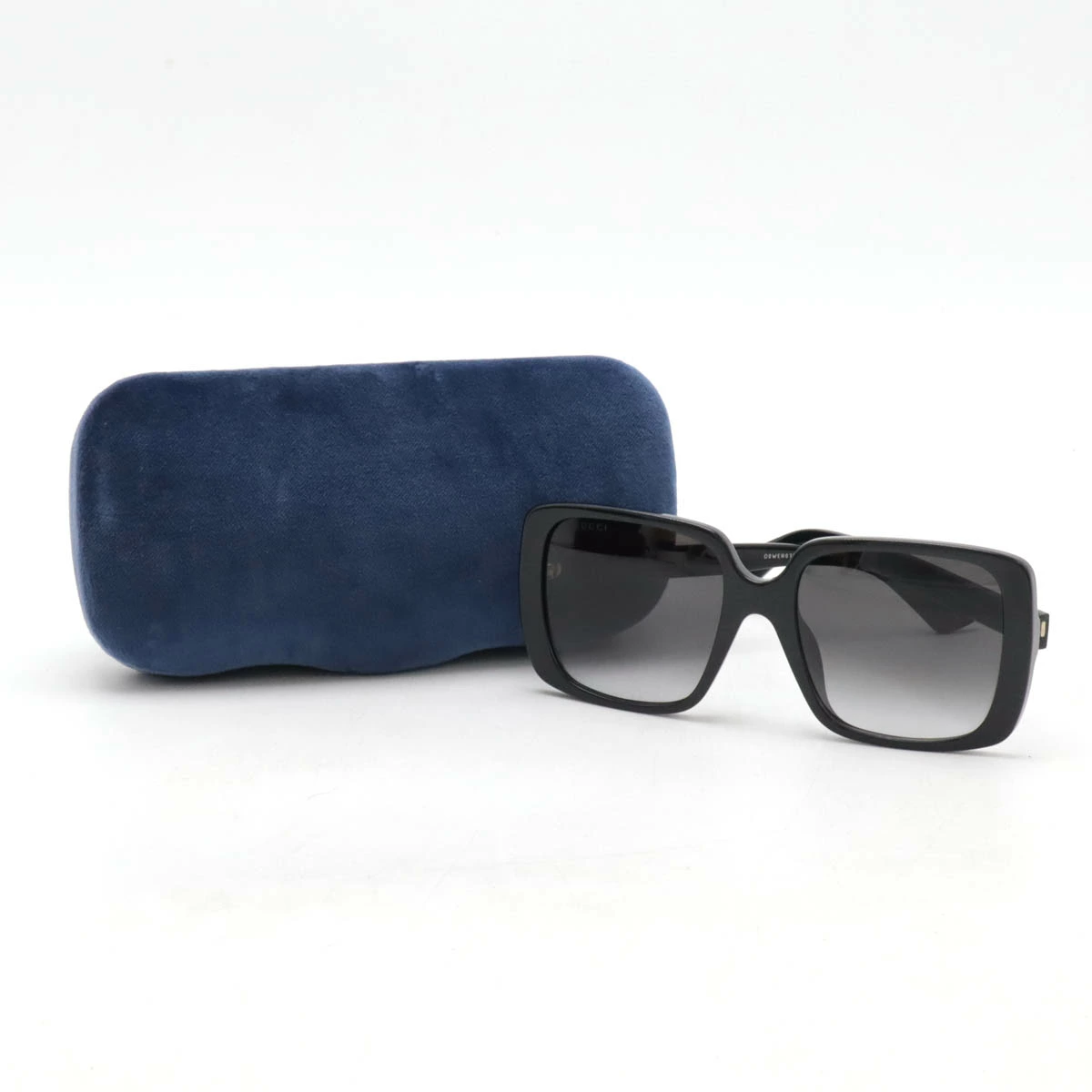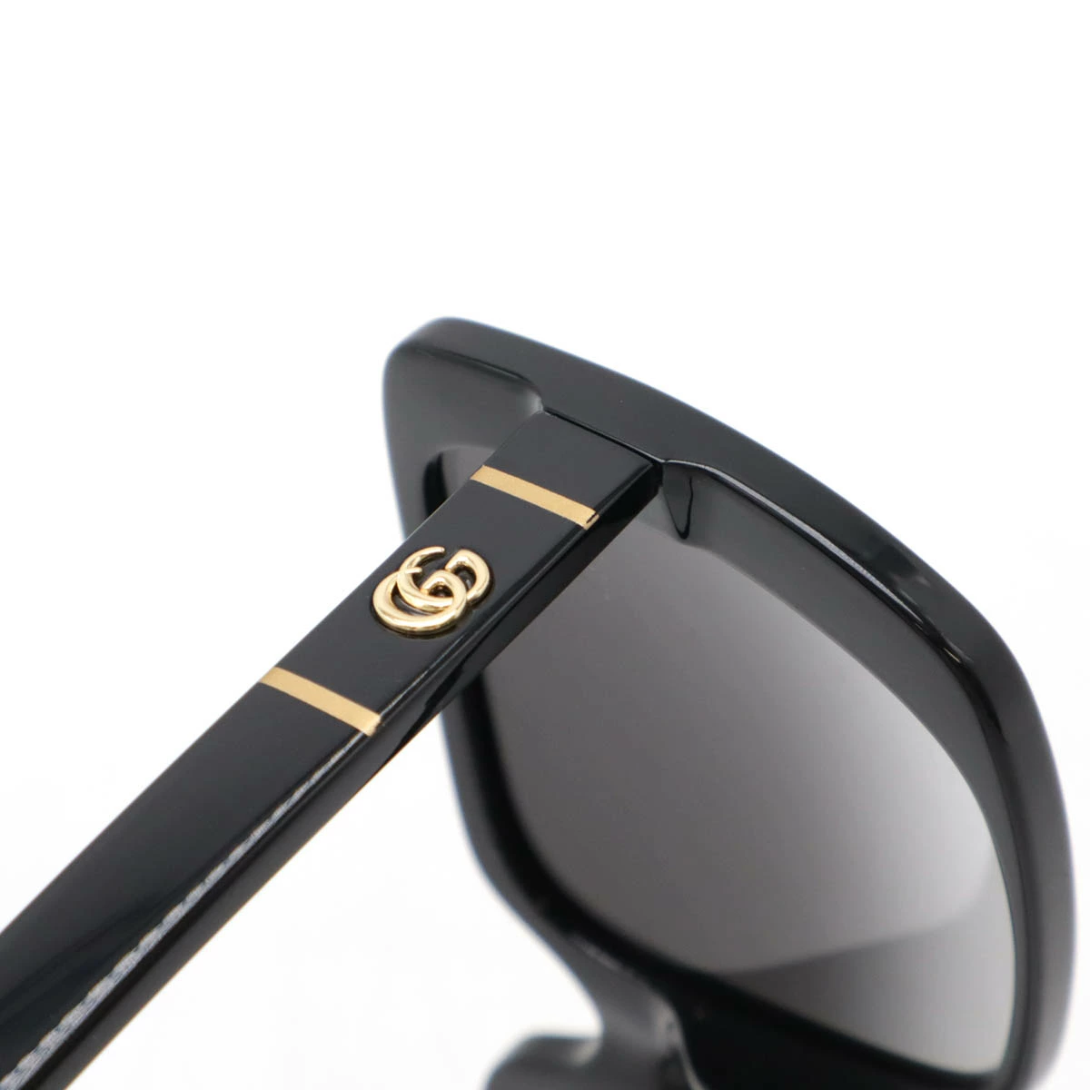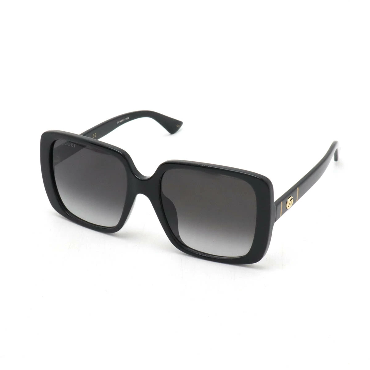 スクエアのシルエットが特徴的で、テンプルにゴールドのラインとブランドロゴが入ったお洒落なサングラスでございます。