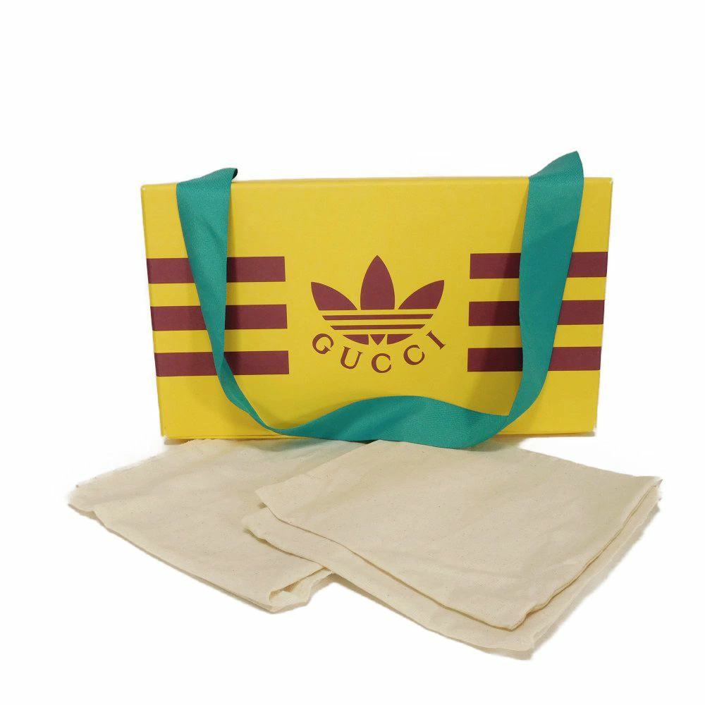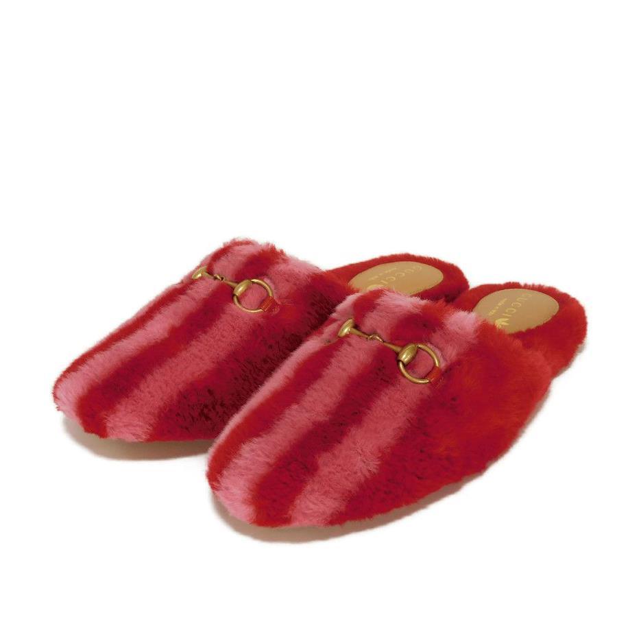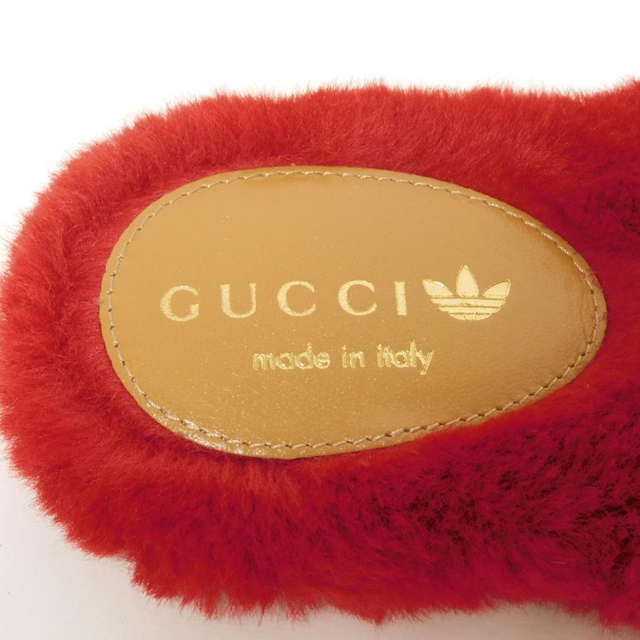ストライプデザインのファー素材にグッチのロゴとアディダスのトレフォイルロゴが箔押し加工された「ホースビット ファー フラット シューズ」ミュールです。 |