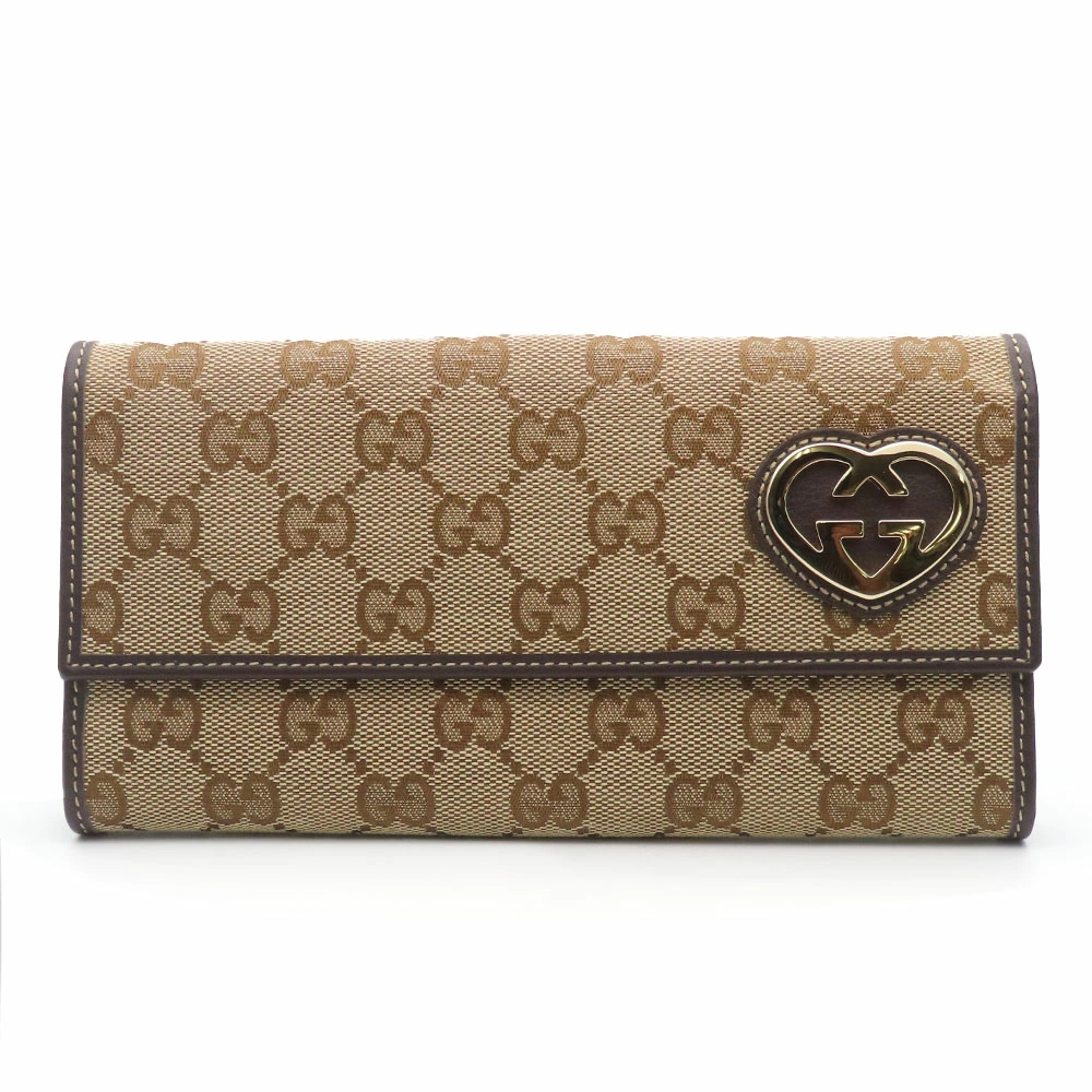 品名【中古】 グッチ 長財布 245723 GGキャンバス レザー ブラウン ベージュ ゴールド金具 Wホック ラブリーハート 小物 レディース 女性 GUCCI