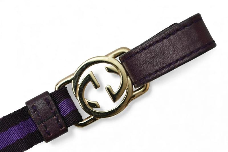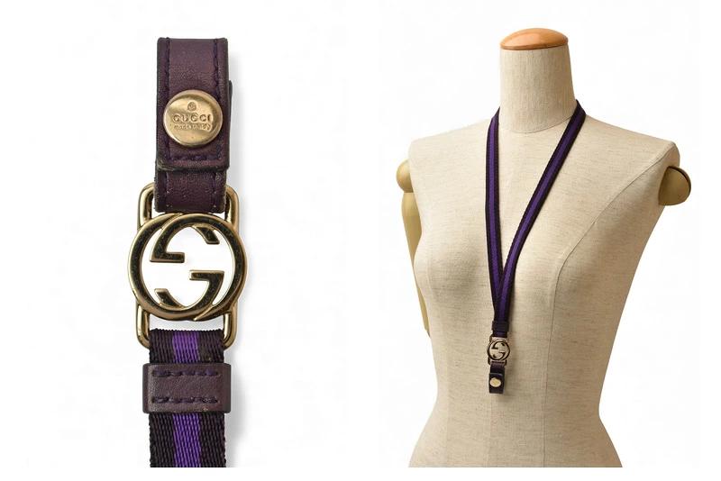 | 商品説明 | グッチ/GUCCI伝統のウェビングラインのネックストラップ。アクセントの3本ラインは、パープルとダークパープルのコンビカラー。リングを取り付けると、シーンにあわせいろいろな使い方ができるので、とっても重宝します! |