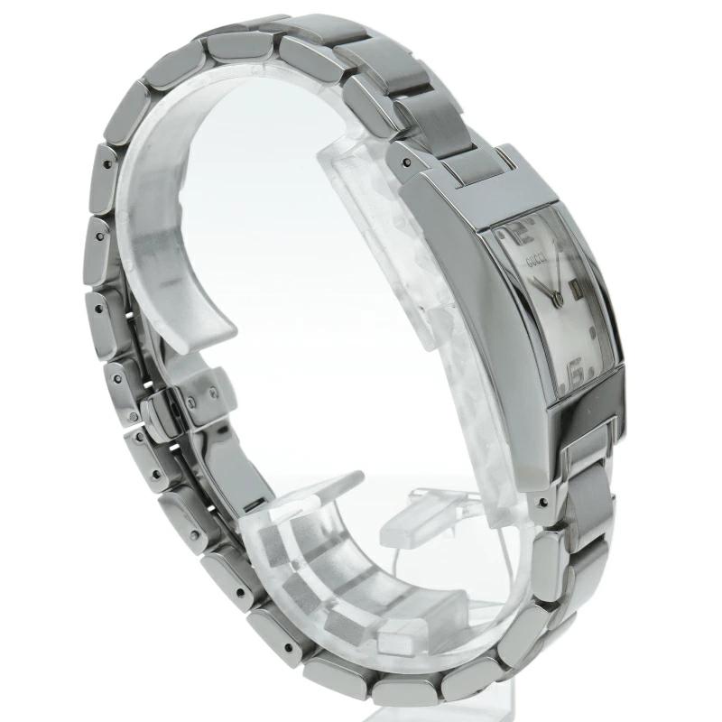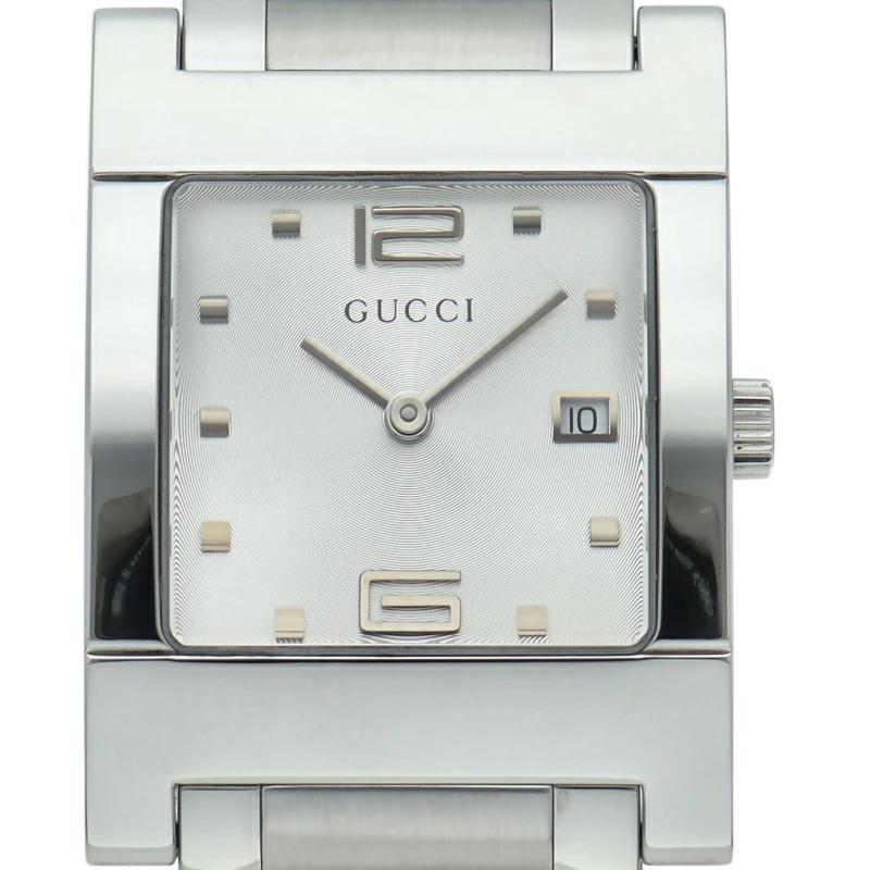 洗練されたデザインが光るグッチのスクエアフェイスウォッチ。スタイリッシュなスクエア型ケースと、シンプルでありながらも高級感漂う文字盤が特徴。美しいステンレススチールのブレスレットは、どんなコーディネートにもエレガントなアクセントを加えます。