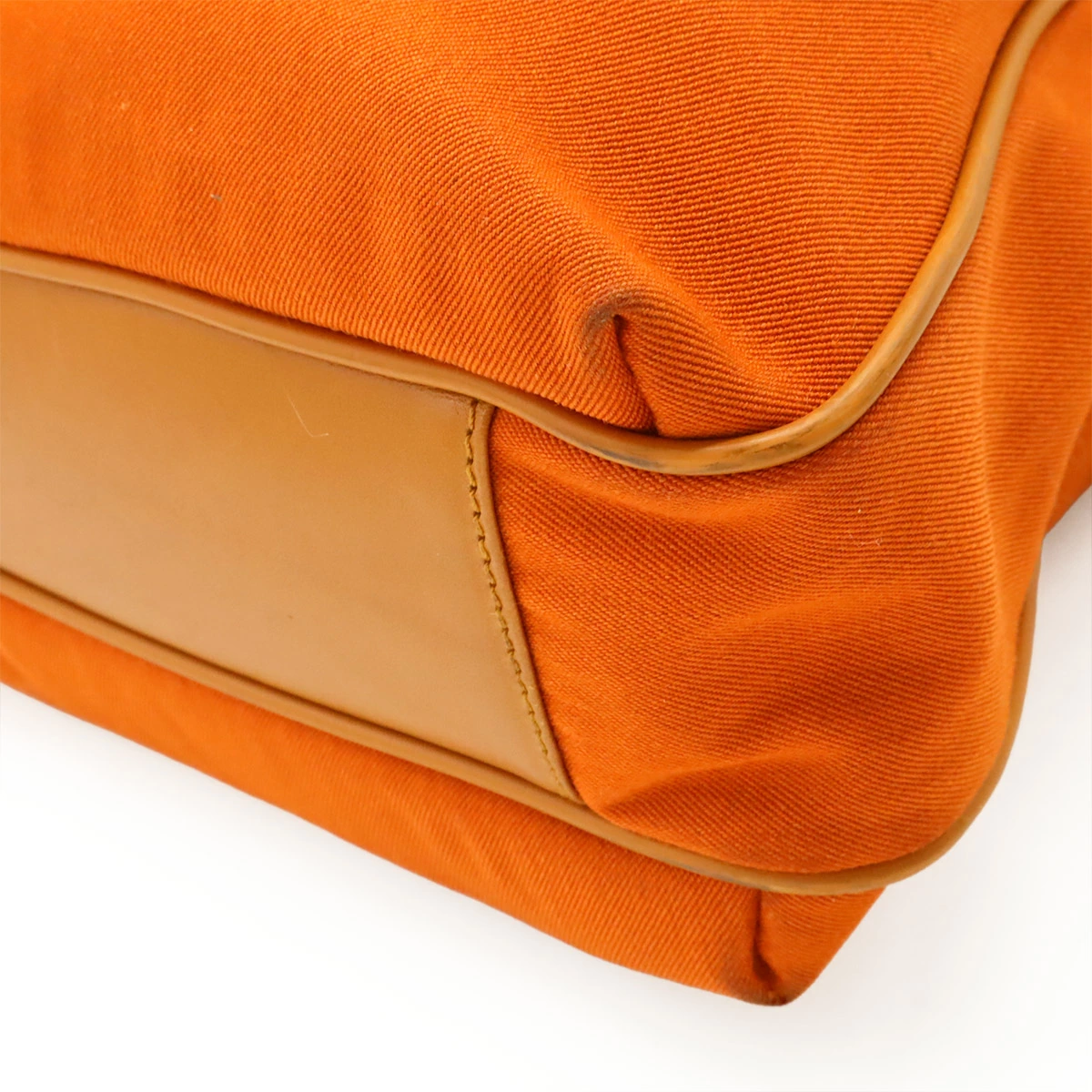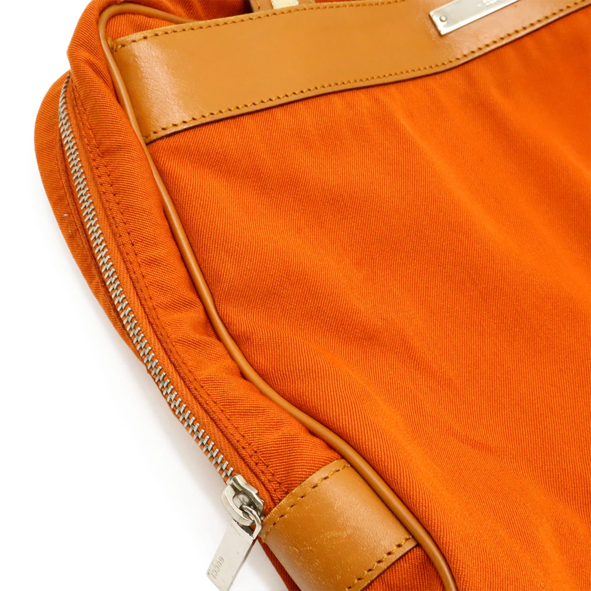 オレンジのキャンバス地にレザーがお洒落なトートバッグ。