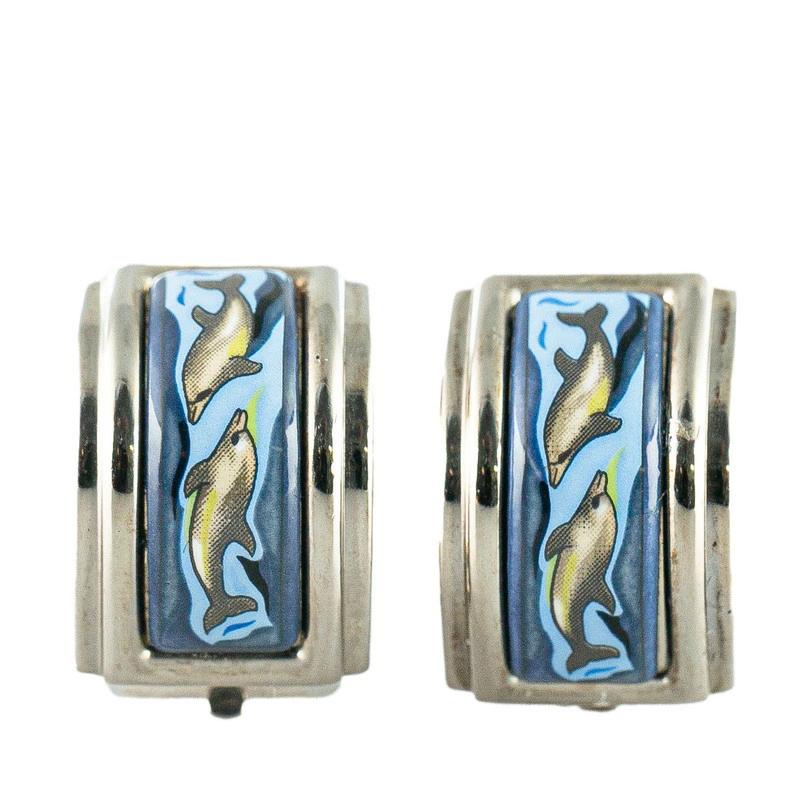 Pre-owned Hermès enamel dolphin motif earrings in silver, blue, and multicolored metal. Women's.