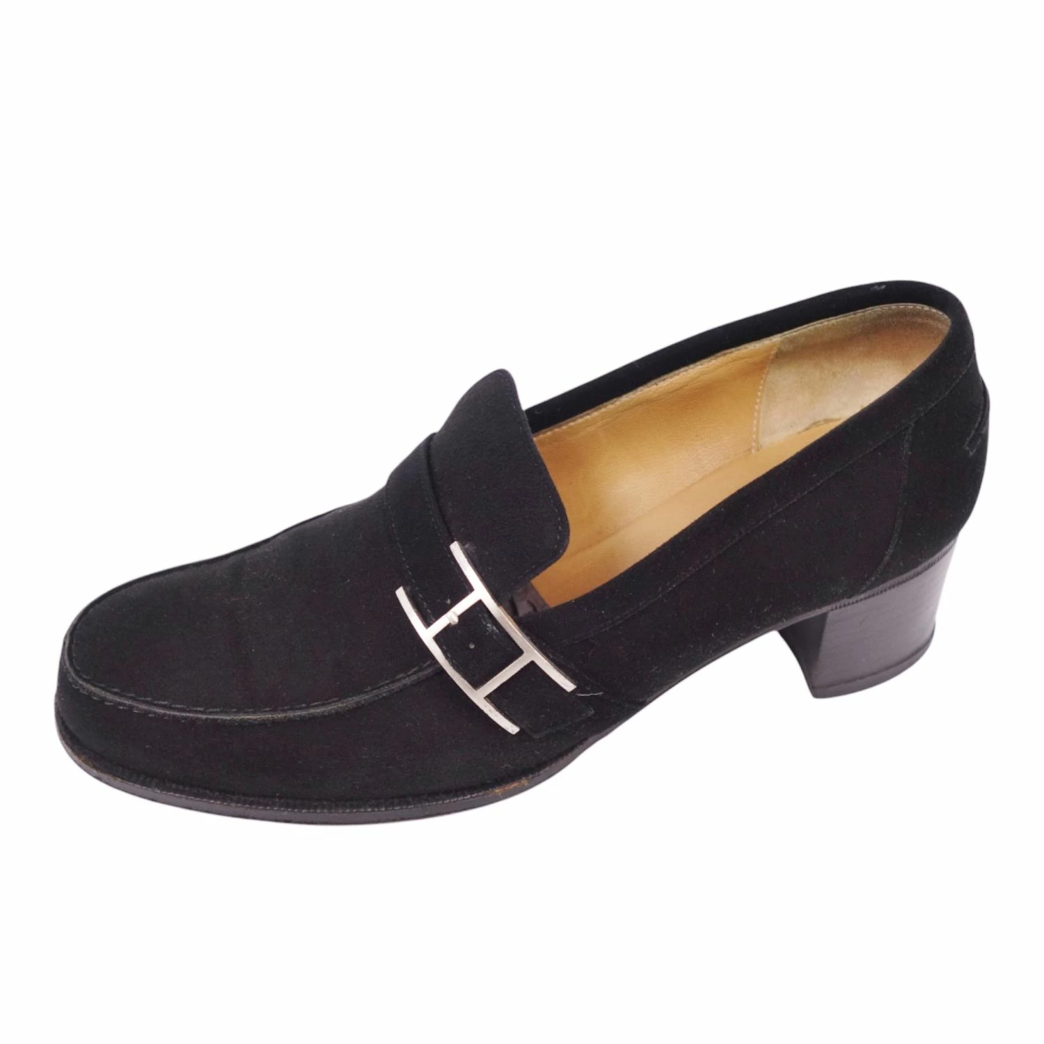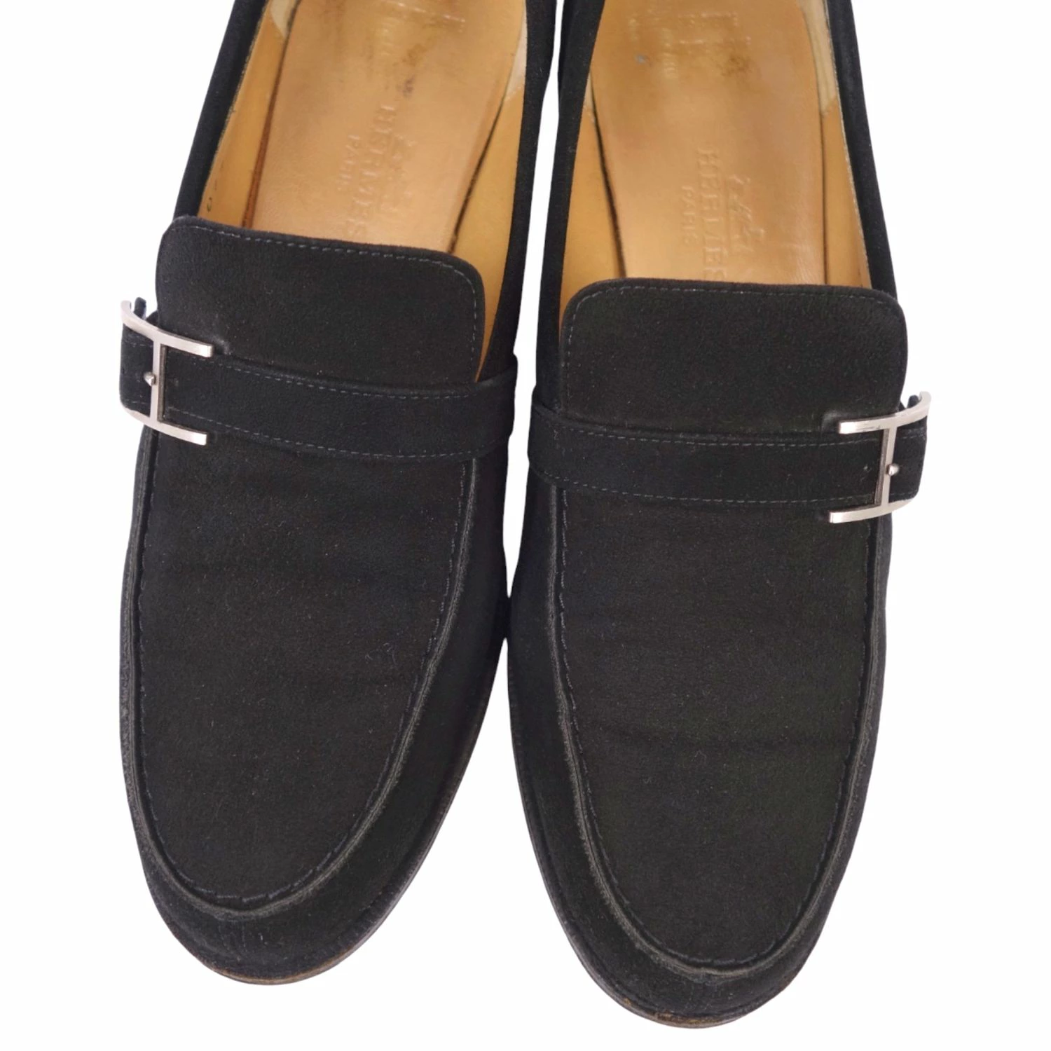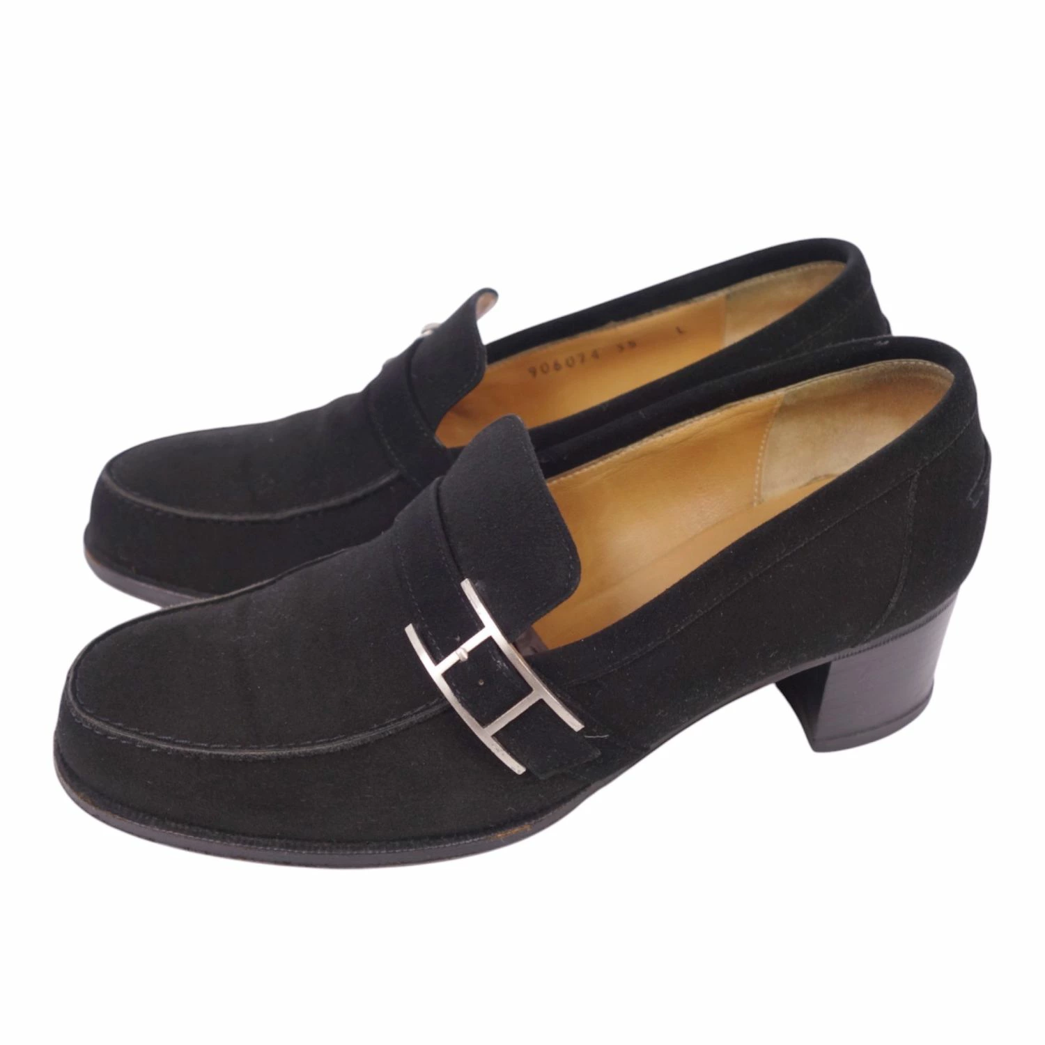 Pre-owned Hermès loafers/moccasins with suede leather and API hardware, featuring an H logo and a heel. Size 35 (equivalent to 22cm), black.
