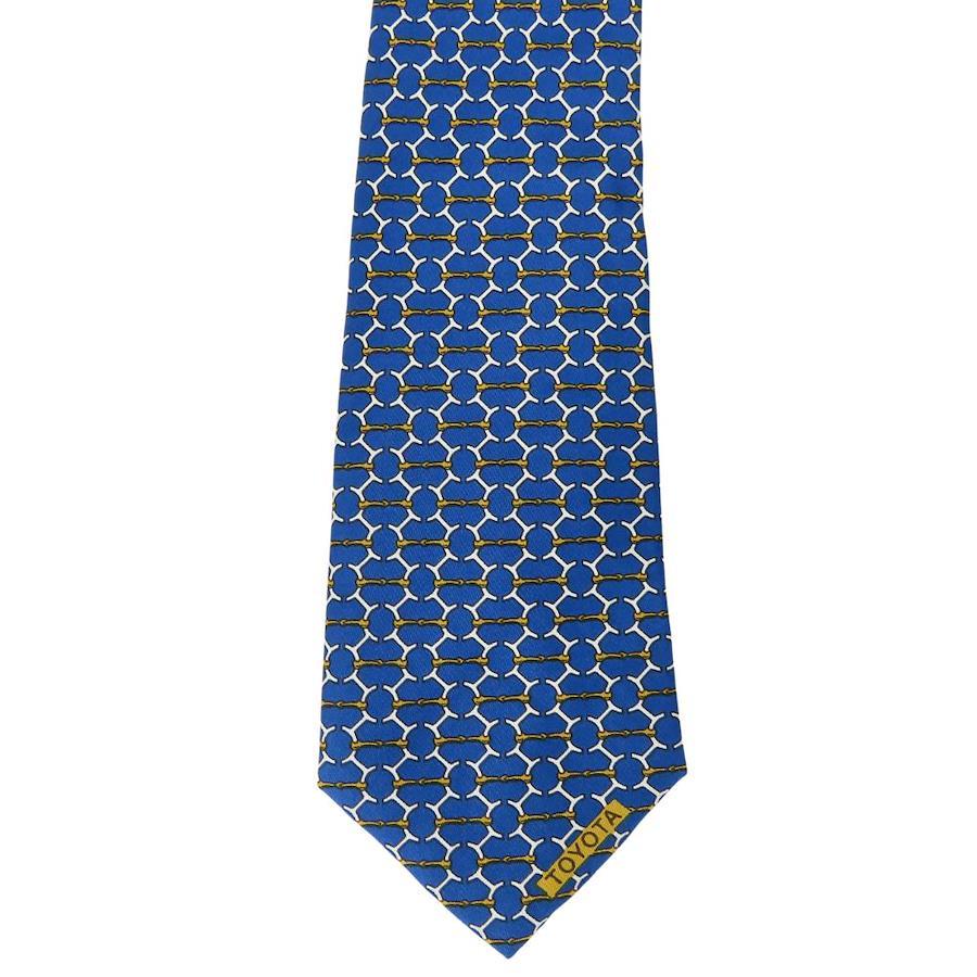 Pre-owned Hermès tie, Toyota limited edition, silk, blue, gold, and white, suitable for men's business suits.