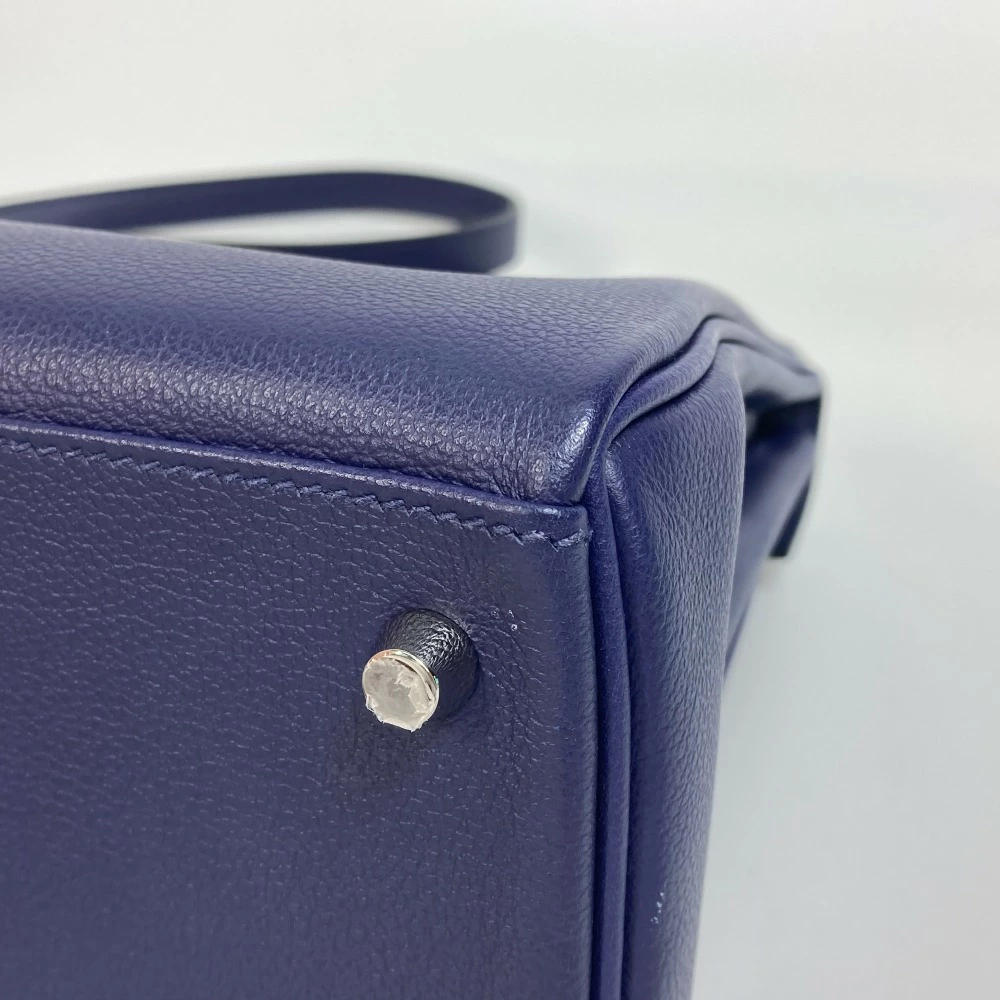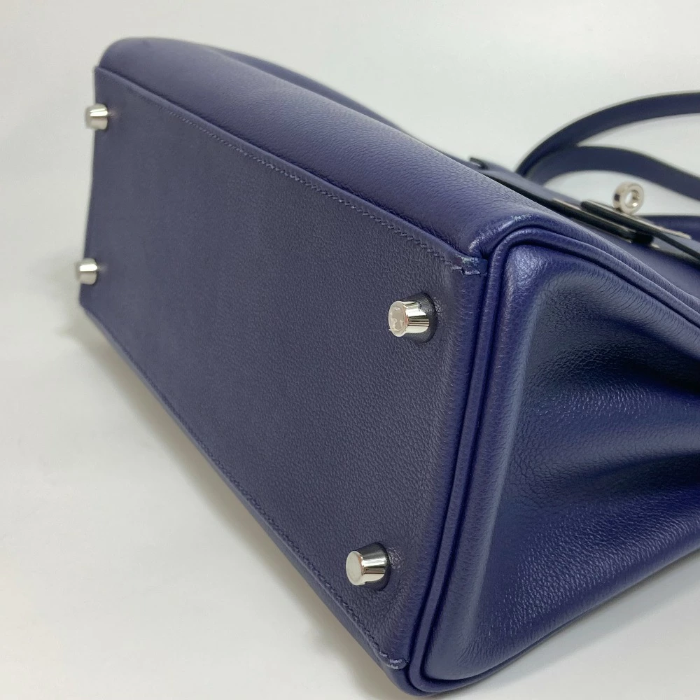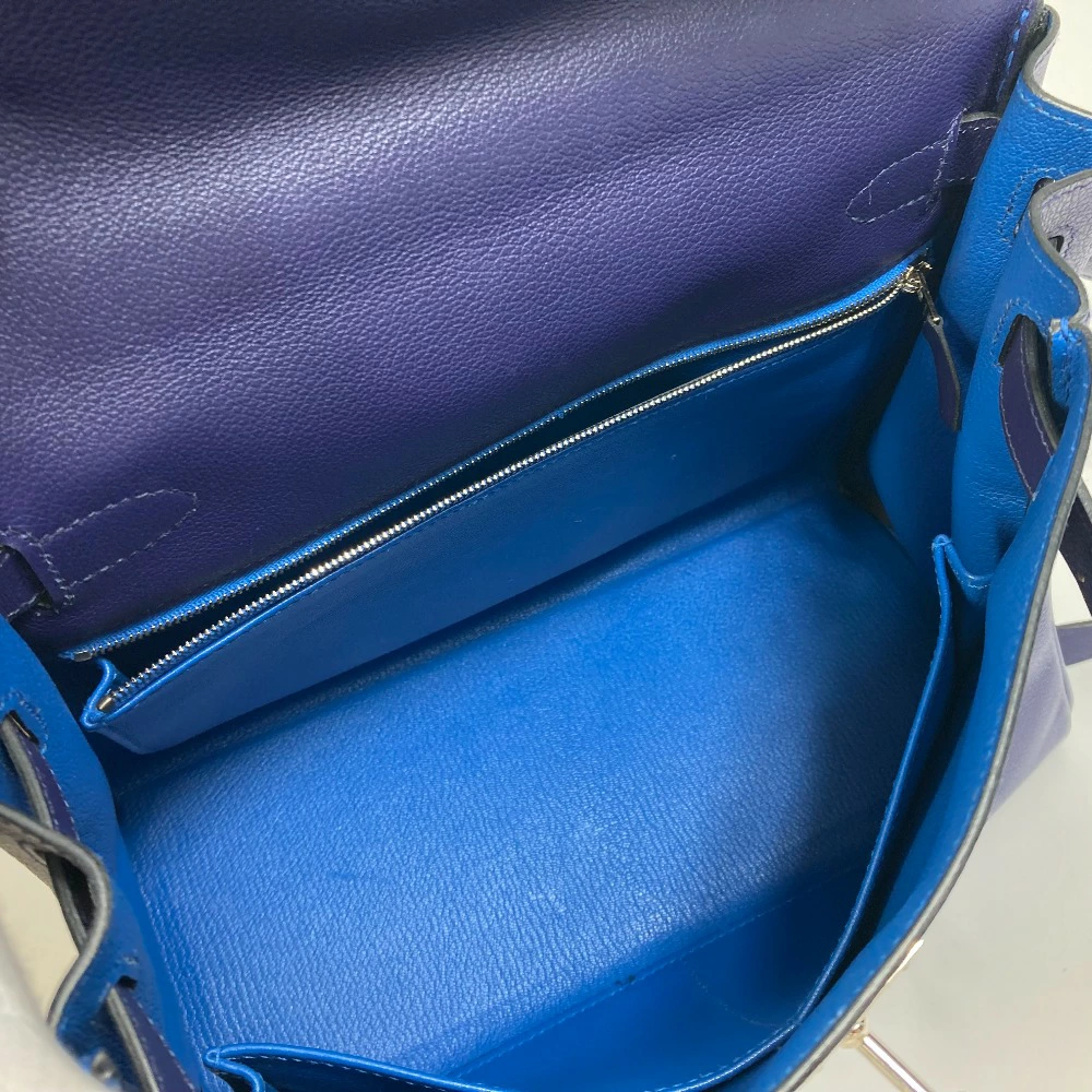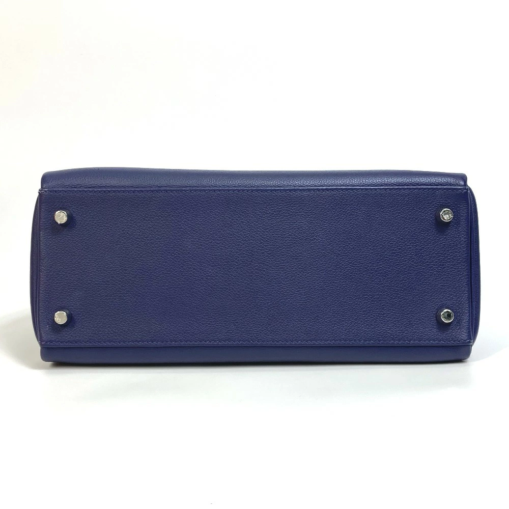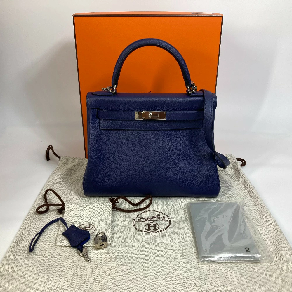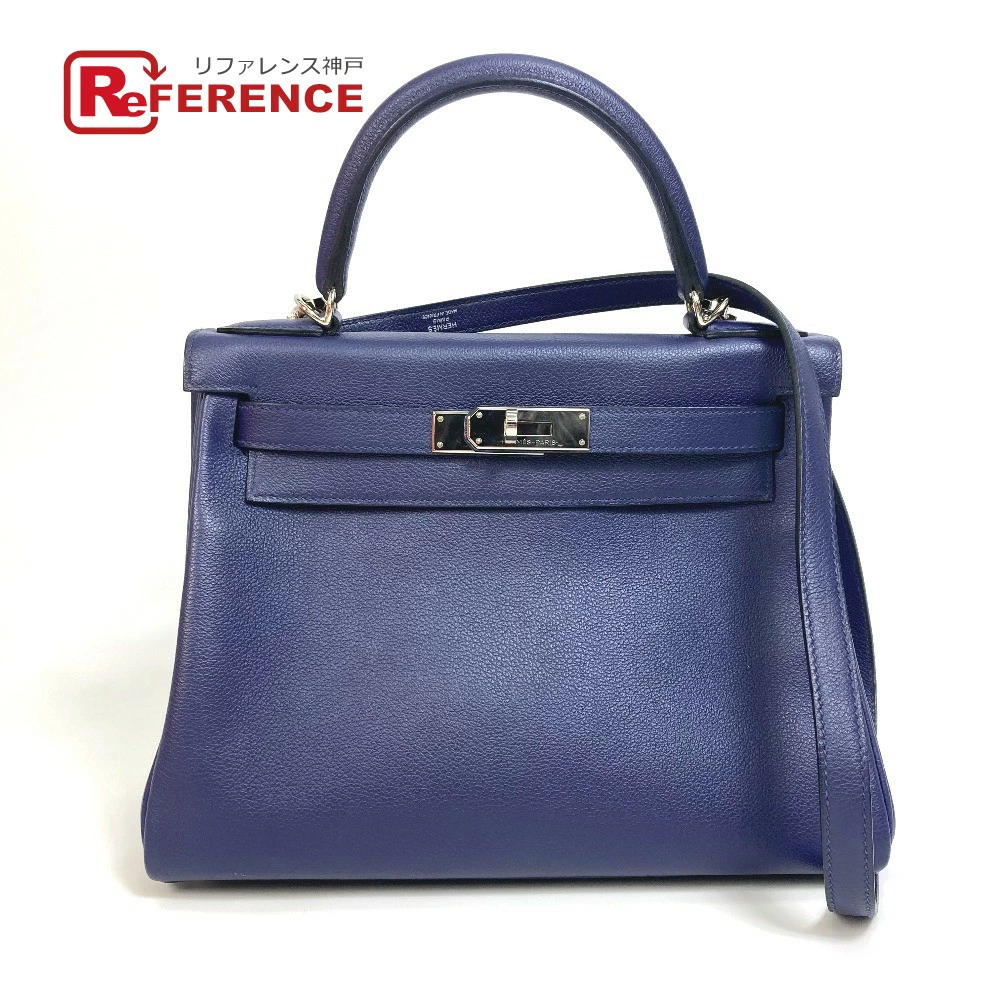 Pre-owned HERMES Kelly Verso 28 bag, inlaid with stitching, suitable for both shoulder and handbags. Features include Evercolor blue ankle straps/blue zellige leather, and silver hardware.