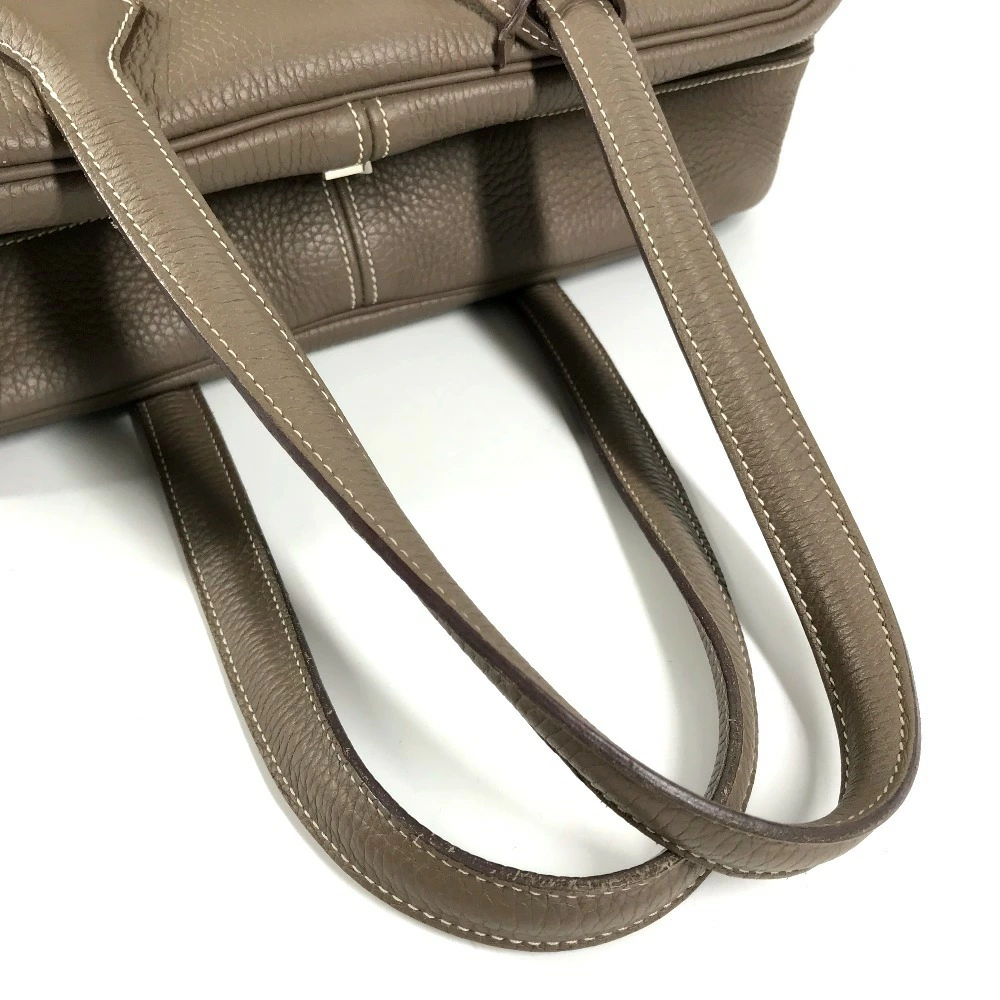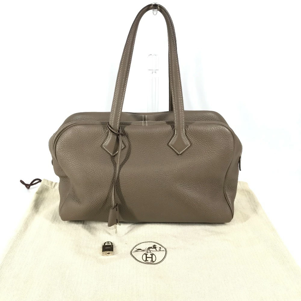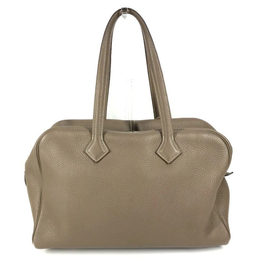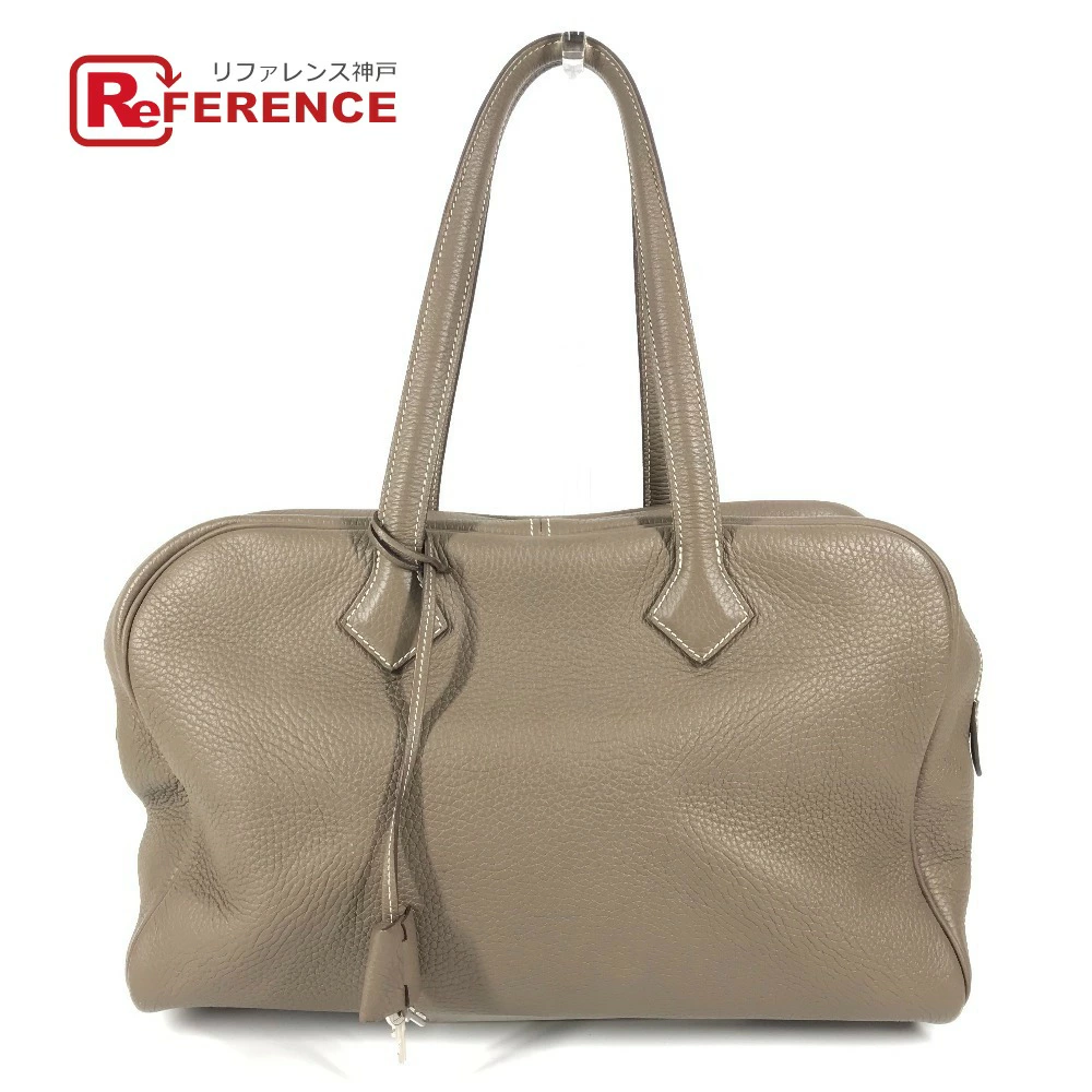 Pre-owned HERMES Victoria 35 shoulder tote bag/Boston bag/shoulder bag in Taurillon Clemence leather with Etoupe and gray accents.