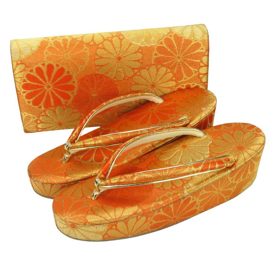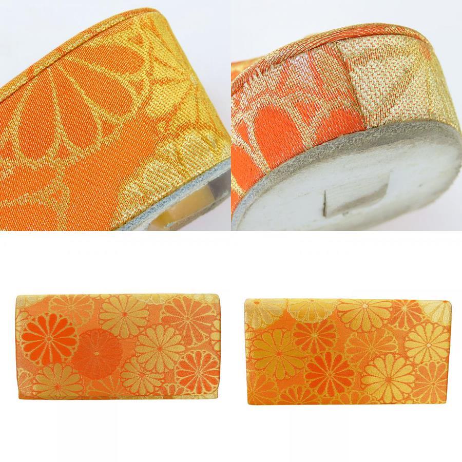 Pre-owned Japanese style bag and sandal set with round chrysanthemum design. Made of pure silk (excluding gold and silver threads) and synthetic leather. Vermilion and gold. Formal, auspicious motif. Suitable for kimono, kimono, and other formal occasions. Women's.