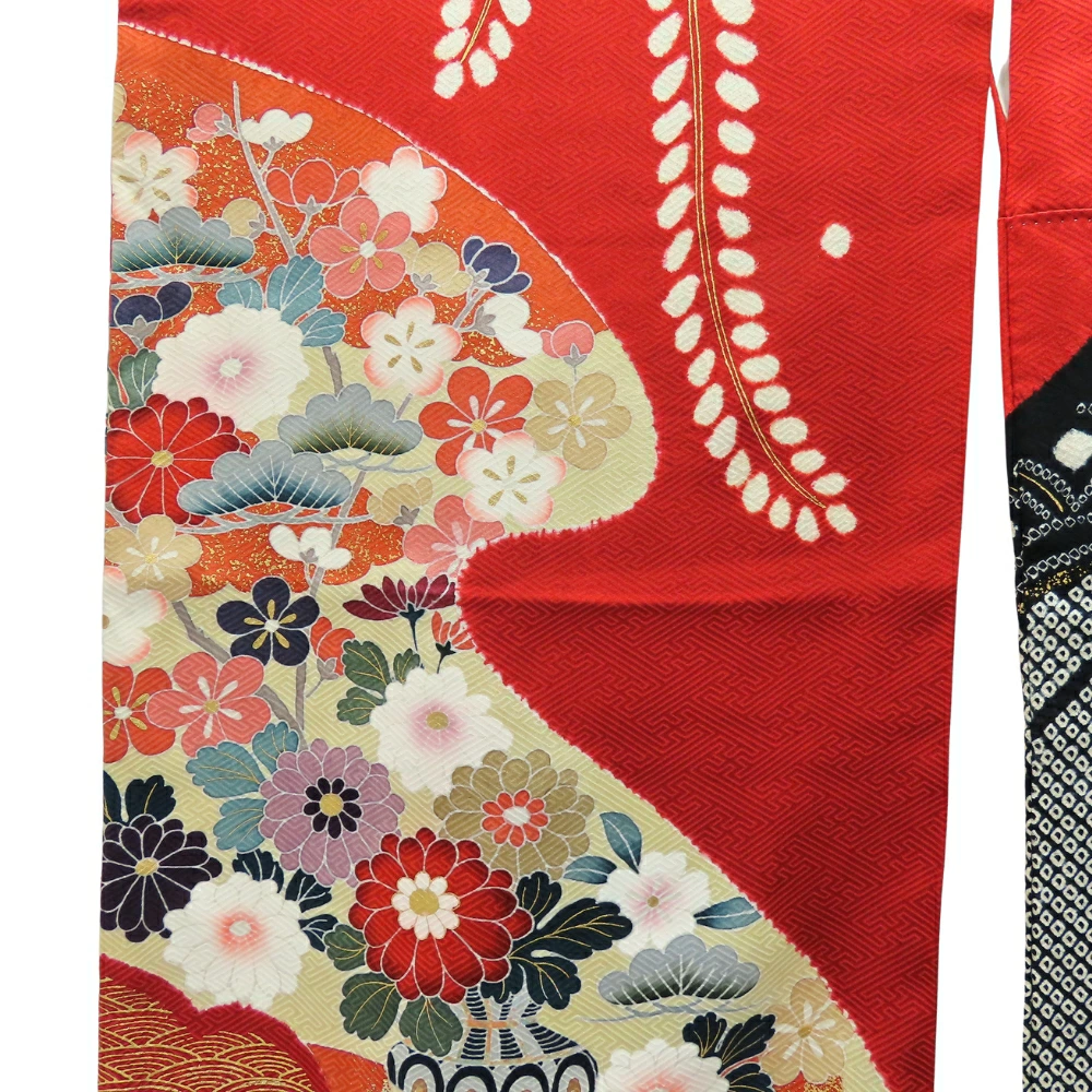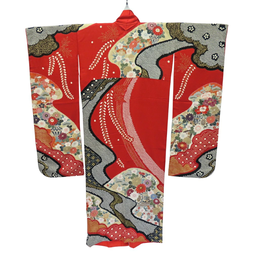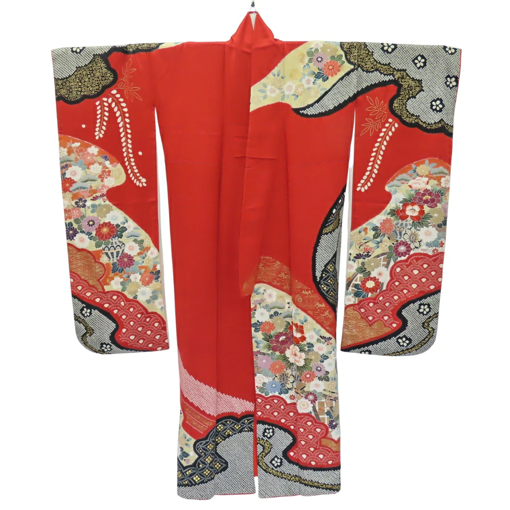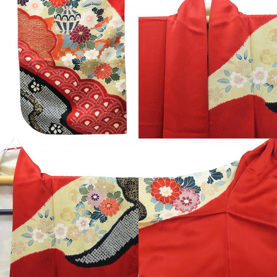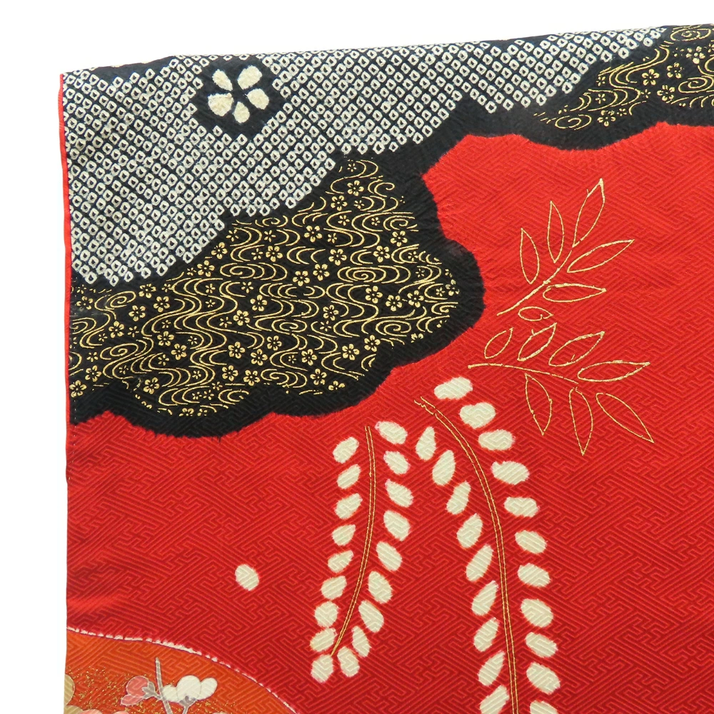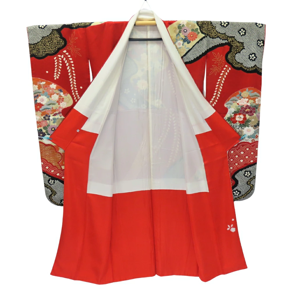 | 品名 | 【中古】 振袖 金駒刺繍 桶絞り 正絹(金銀糸除く) レッド ブラック マルチカラー 手描き 古典柄 成人式 レディース 女性 |