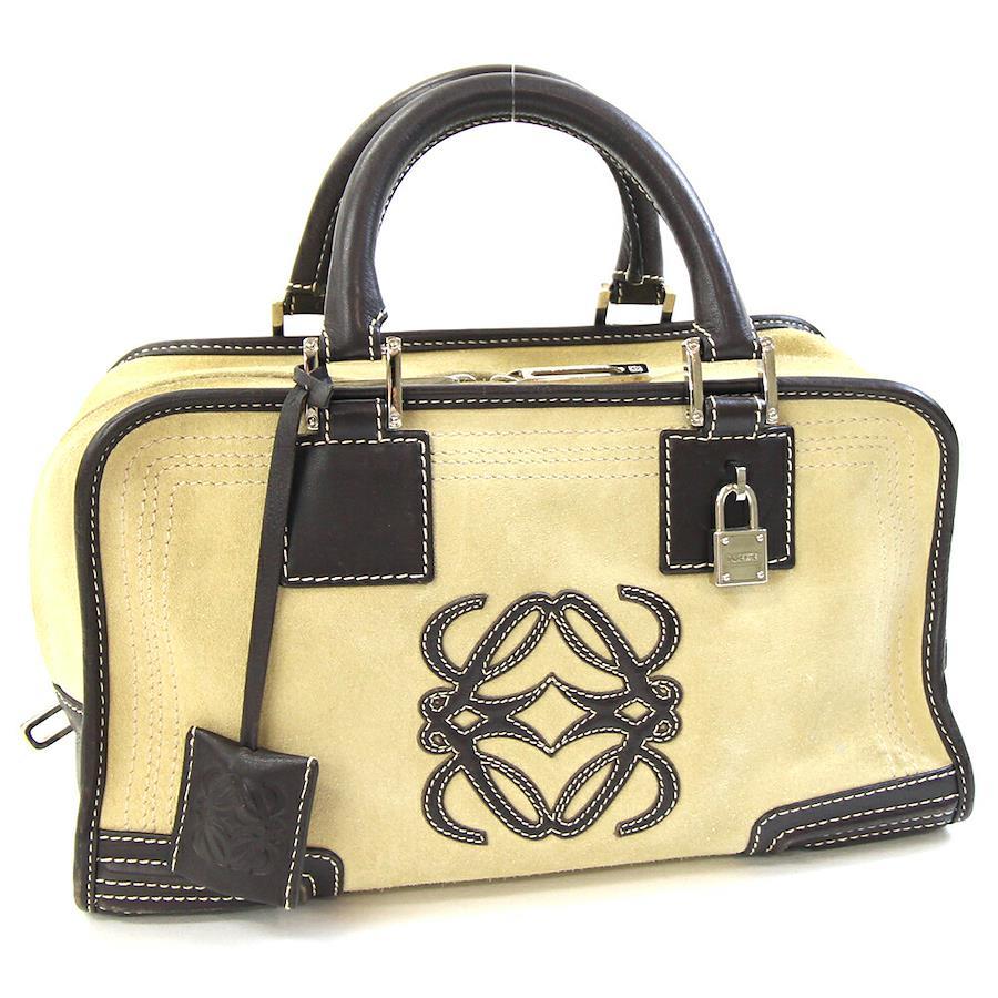 ロエベハンドバッグアナグラムアマソナ28311.86.001イエローベージュダークブラウンスウェードレザー中古ミニボストンロゴ鞄バイカラーレディースLOEWE
