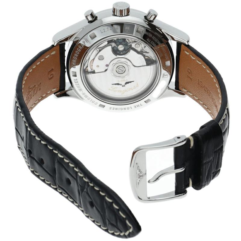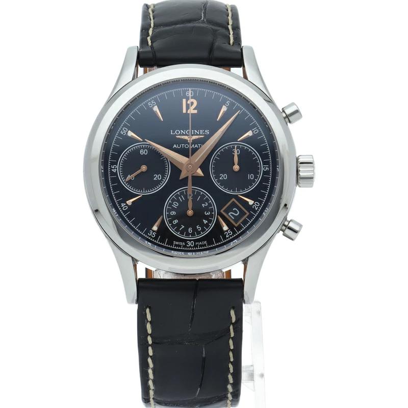 | ドルフィンハンドと丸形プッシュボタンがクラシックな雰囲気を演出する「ヘリテージ コラムホイール クロノグラフ」。39mmのステンレス製ケースには、スイスの名門ETA社がロンジンの為に開発をおこなったコラムホイール式クロノグラフ、54時間パワーリザーブのキャリバー「L.688。2」を搭載します。 |