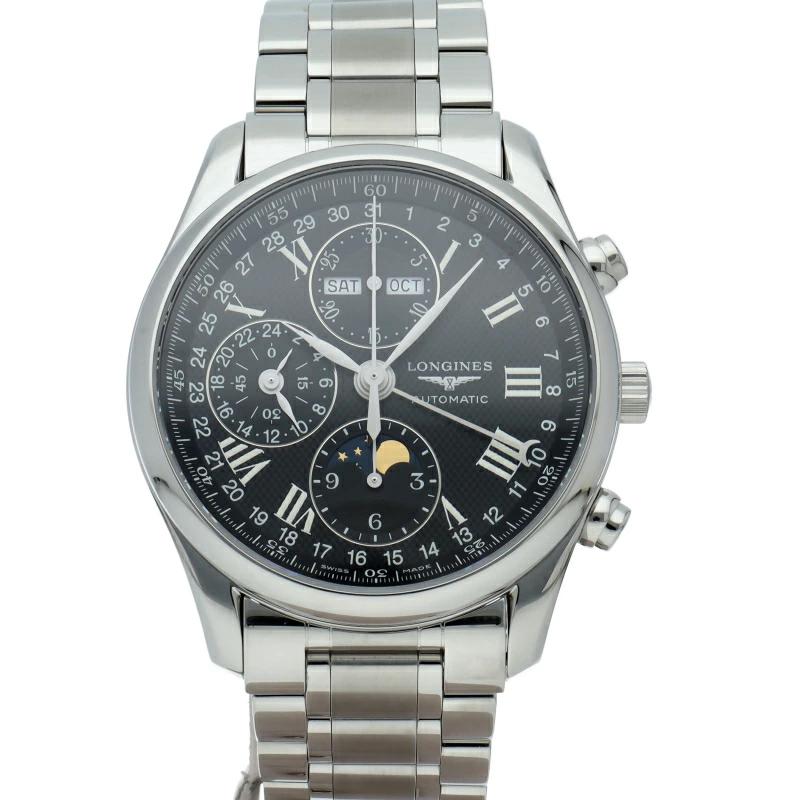 | 名門ロンジンらしい落ち着いた佇まいのが好ましい「マスターコレクション」。2005年の発表以来、ロンジンの栄光の歴史を感じさせるクラシカルなコレクションとして人気を博しています。こちらはそのトリプルカレンダームーンフェイズクロノグラフモデル。ケースはシースルーバックになっておりますので、ムーブメントの動きをお楽しみいただけます。 |