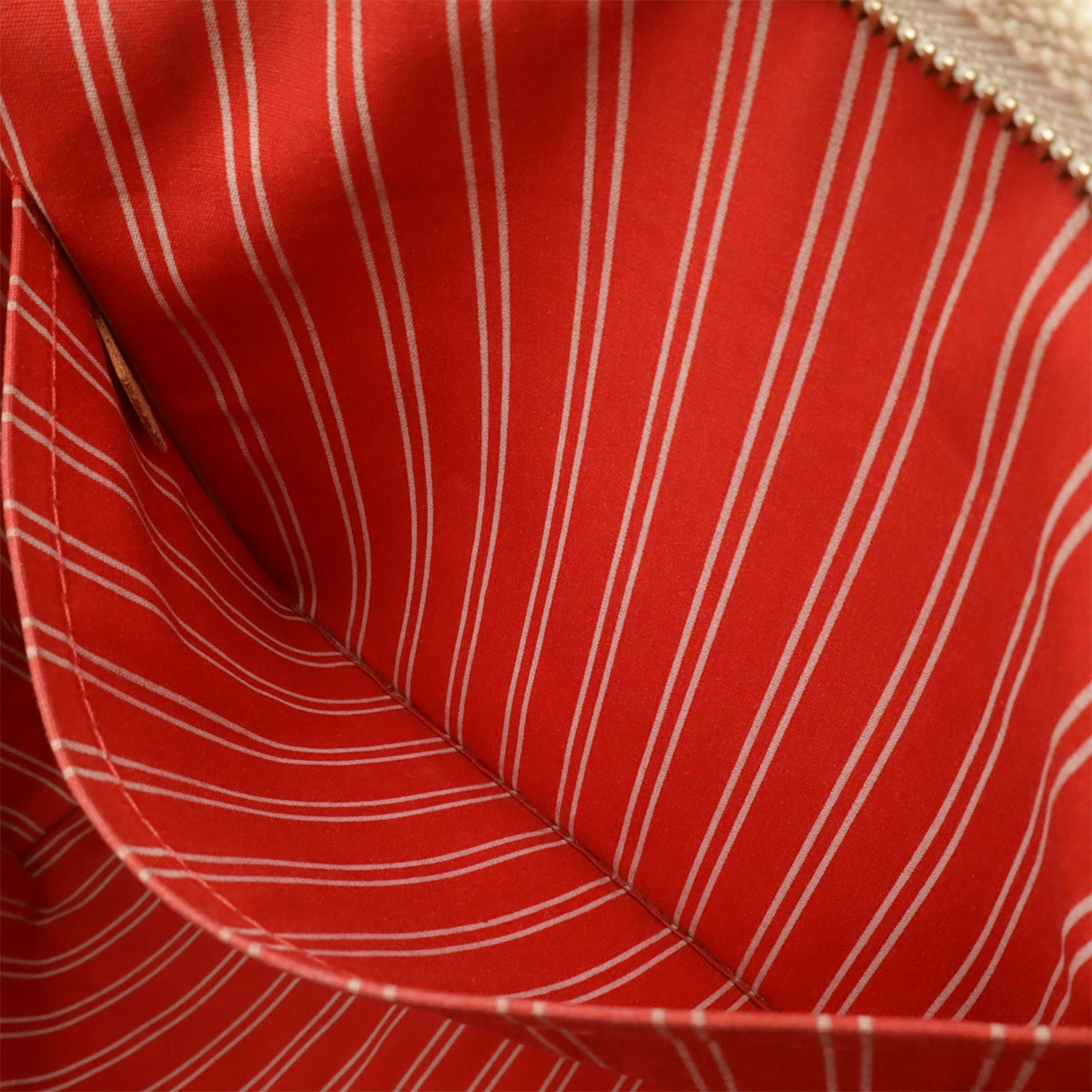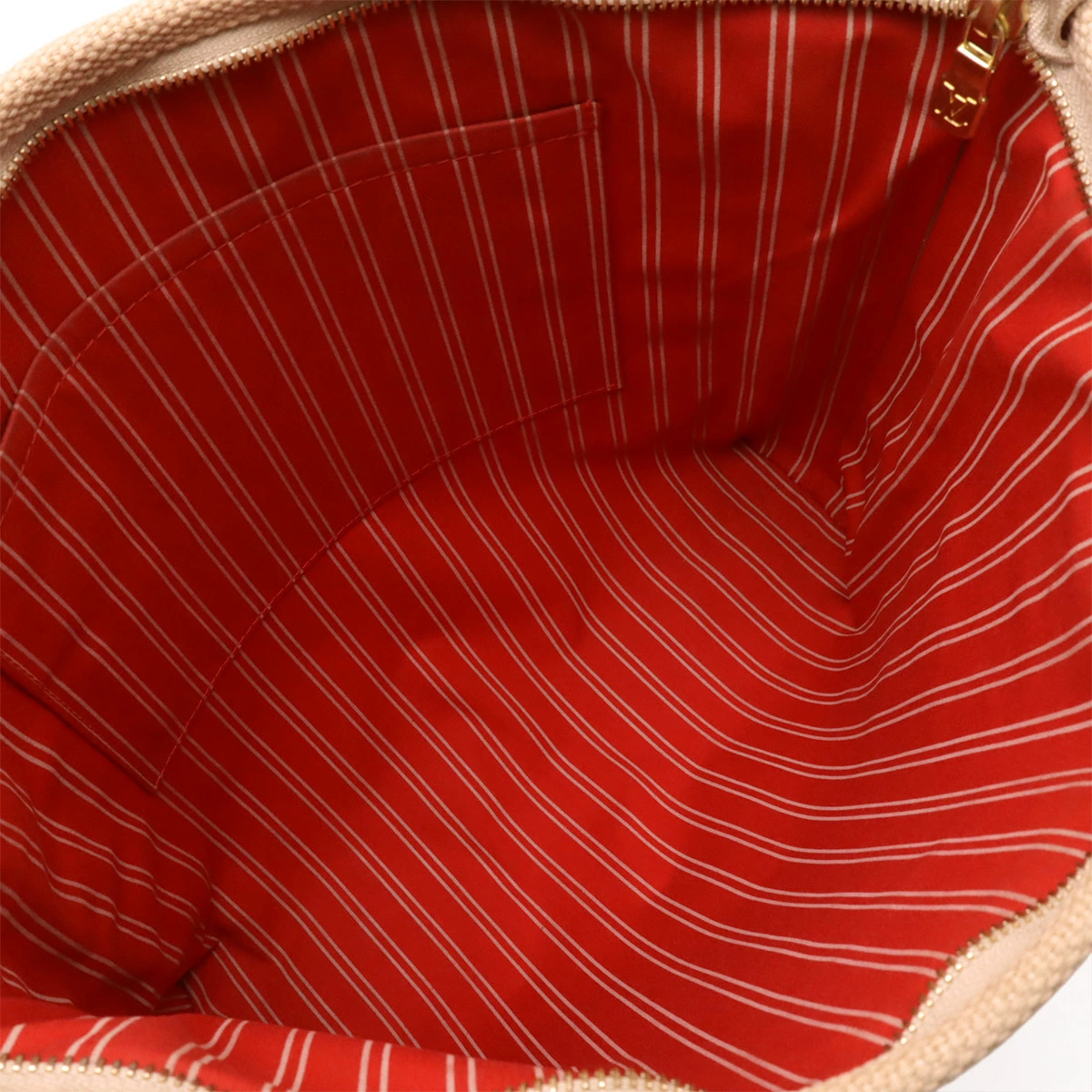 フロントのプレート金具が高級感を醸し出しており、内側のストライプ柄も、とてもオシャレなデザインのアイテムでございます。