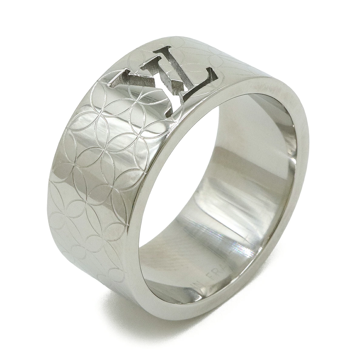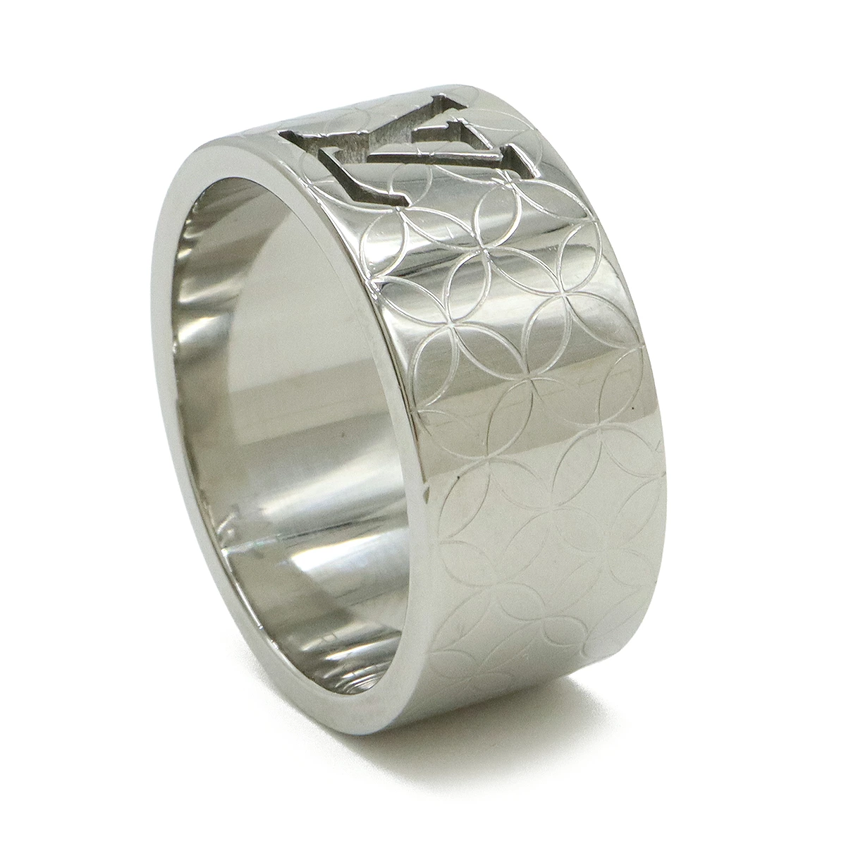 中央にロゴが型抜きされ、ぐるりとサークル状のフラワーモチーフが施された、ブランドアピール抜群のバーグ・シャンゼリゼリング。