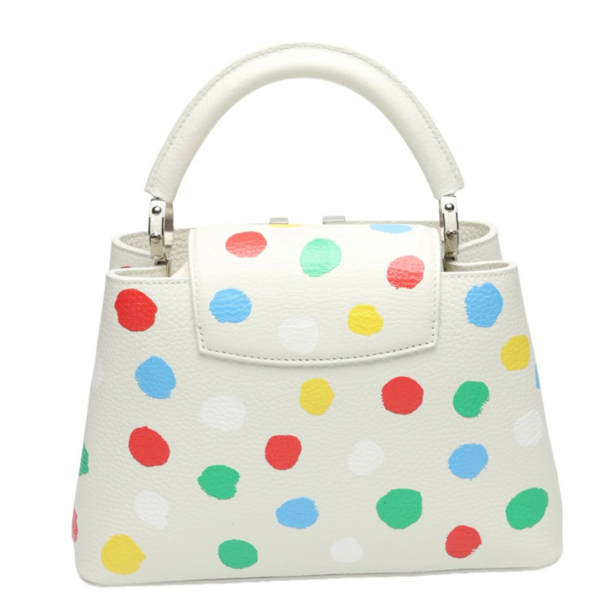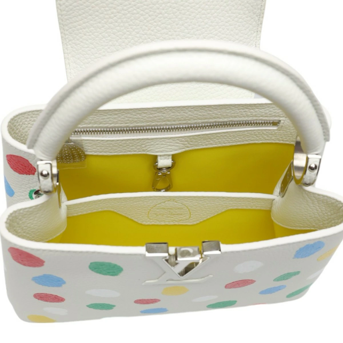 Pre-owned Louis Vuitton Capucines BB shoulder bag with painted dots by Yayoi Kusama, model M21637, white, LV, stainless steel.