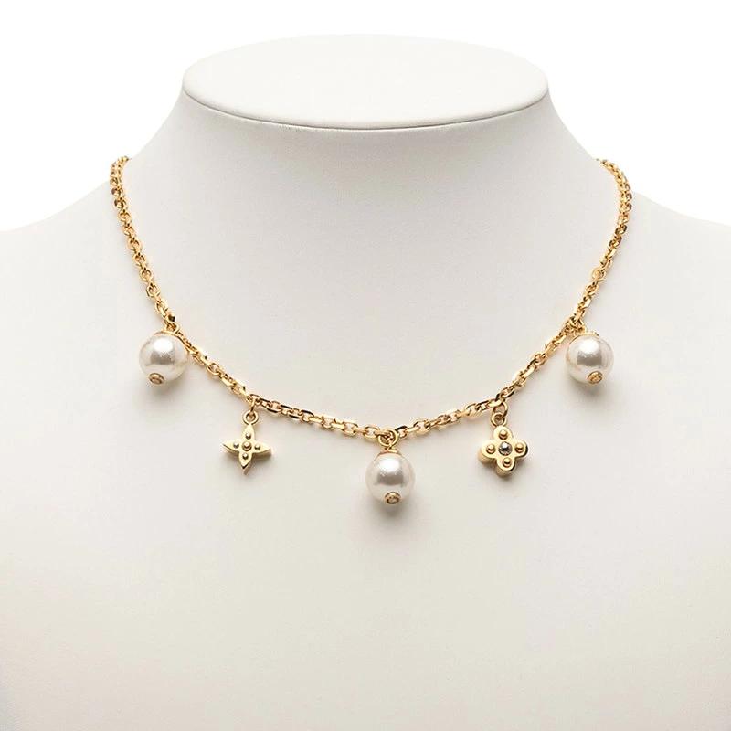Pre-owned Louis Vuitton Charmy Pearl Monogram Flower Necklace M75443, Gold Plated, Women's.