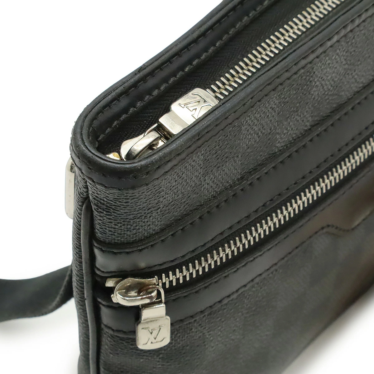 パイピングヤブレ、レザー部分スレ、塗り跡、しっとり感、ポケット内汚れ、上部ファスナーレーン破れ