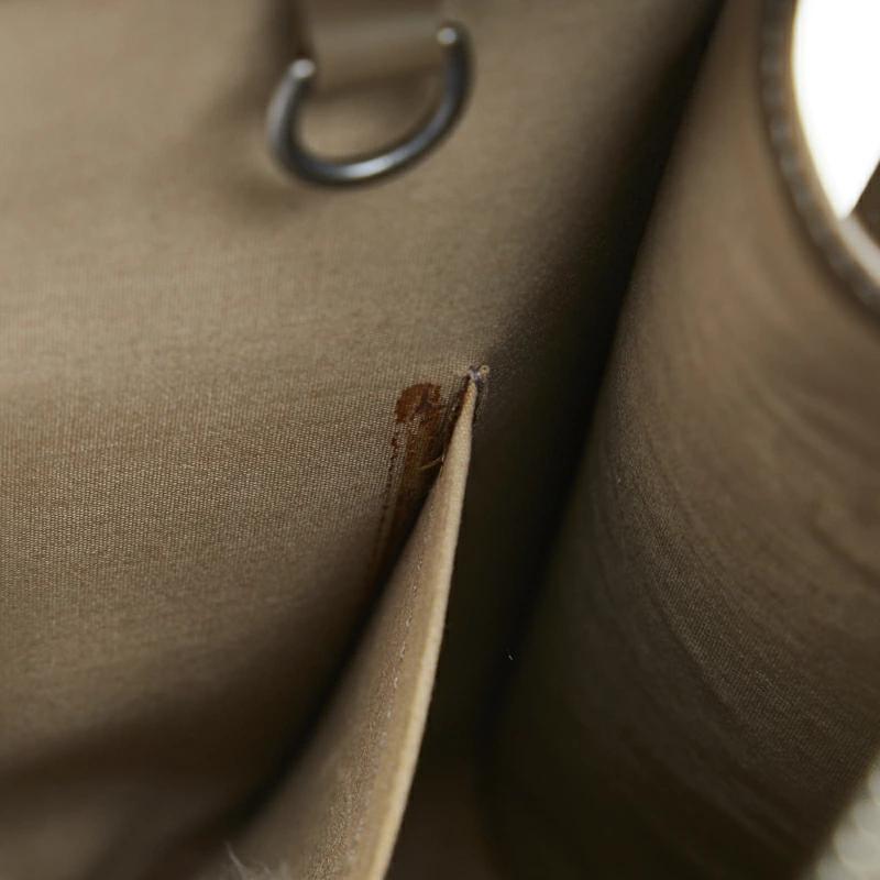 | 状態ランク | B 外側⇒僅かなスレ・僅かなシミ、オープンポケット内側に汚れ サイド⇒スレ・線キズ、フチスレ 底面⇒スレ・シミ・角スレ ハンドル⇒スレ・目立つひび割れ・型崩れ、コバにスレ・はがれ・ひび割れ 金具⇒小キズ・クスミ 開閉口⇒フチにスレ・ひび割れ 内側⇒メインとポケット内側に複数大きいシミ・汚れ・生地浮き・ノリ染み |