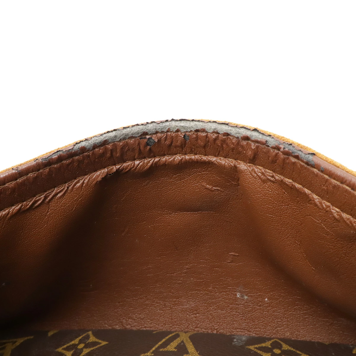 中央くぼみ、ヌメ革ヤケ、スレ、ヒビ、ポケットフチ剥がれ、内側シミ