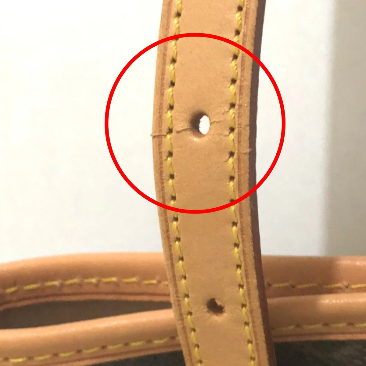 | 外側 | ランク:A 表面:小キズ ハンドル・ストラップ:亀裂 コーナー:小キズ、スレ ヌメ革にヤケや金具による薄汚れあり 底の金具に傷あり 一箇所ハンドルの長さ調節穴部分に亀裂あり(画像14枚目参照) |