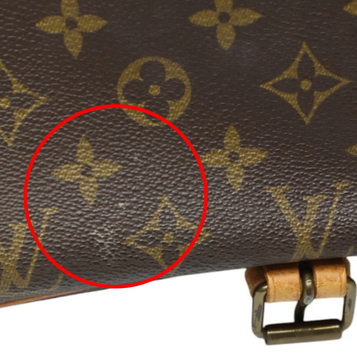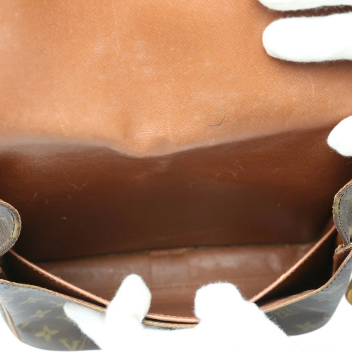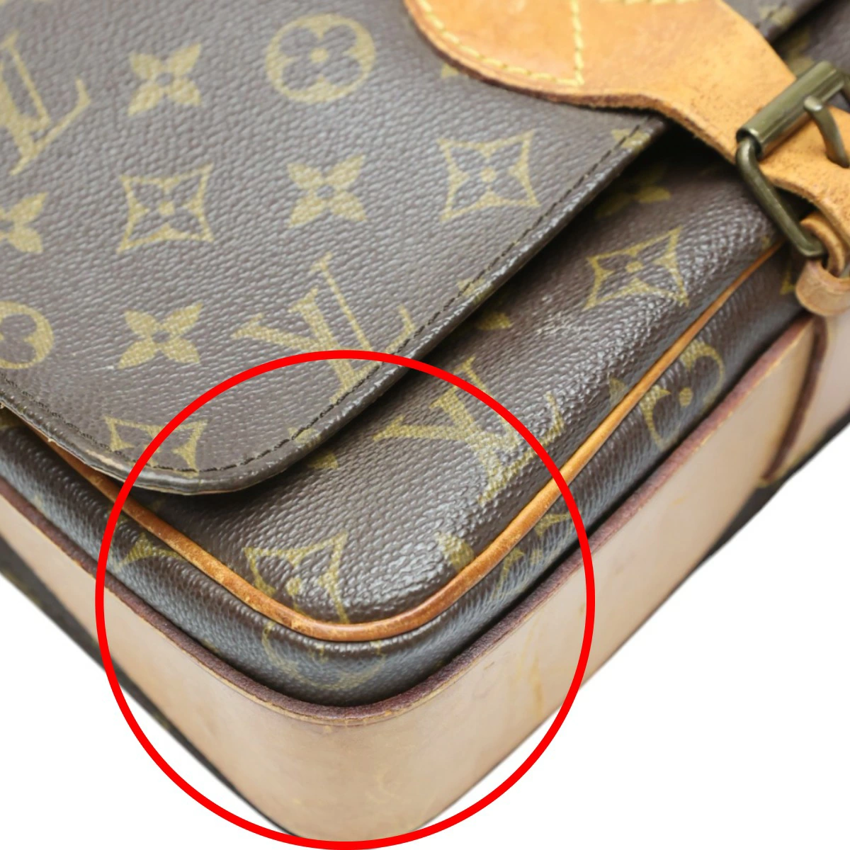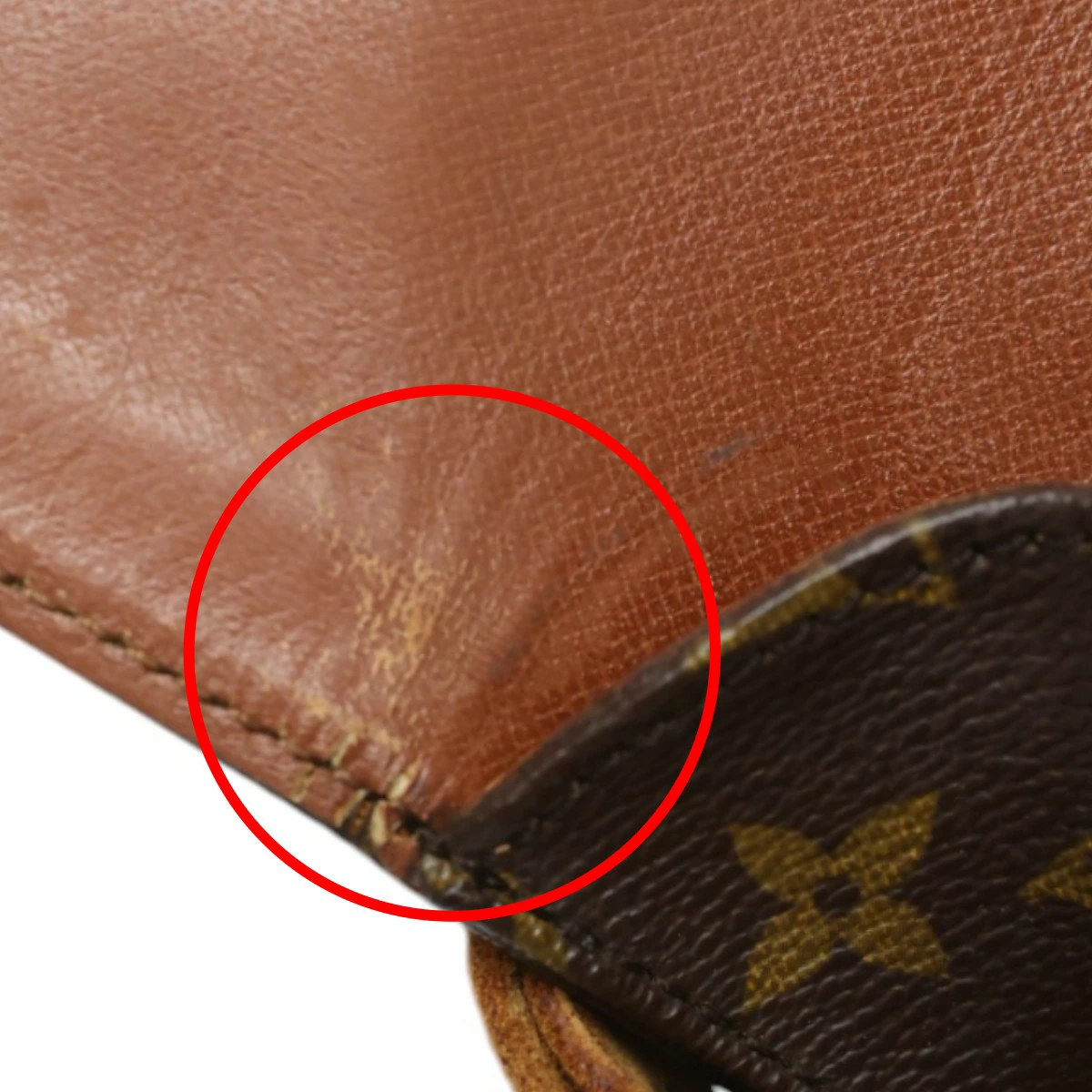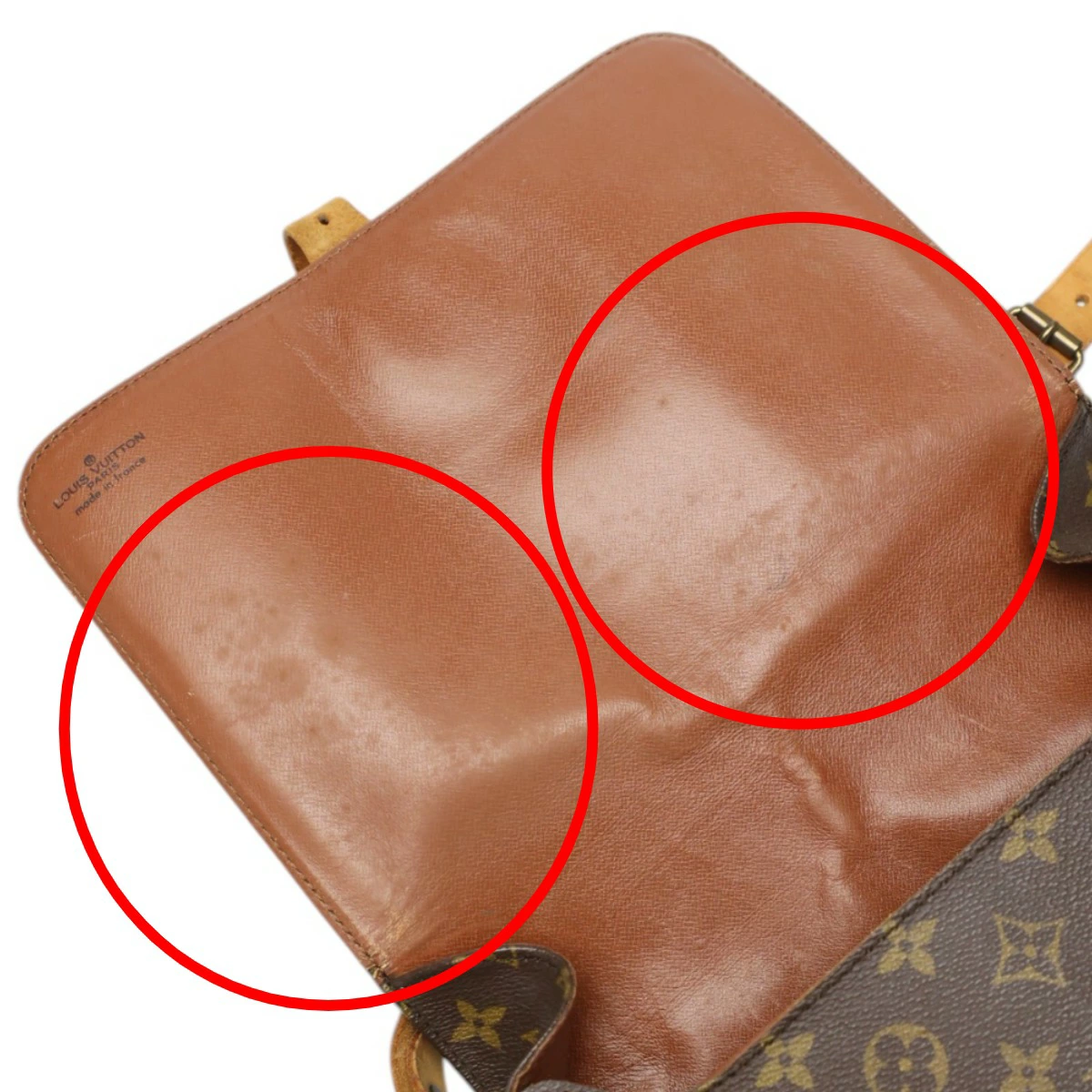 | 外側 | ランク:B 表面:キズ、焼け、汚れ、スレ 切り替えし部分:キズ、焼け、汚れ、スレ 形状:やや型崩れ ハンドル・ストラップ:キズ、焼け、汚れ、スレ、シワ、亀裂 コーナー:焼け、汚れ、スレ 側面、底面のヌメ革焼けやシミ、スレがあります(画像5-9枚目) ショルダーやフラップベルトに焼けやシミ、キズや亀裂、シワあります(画像10、18-20枚目参照) 表面や裏面のモノグラム地に汚れあります(画像2、11枚目参照) |